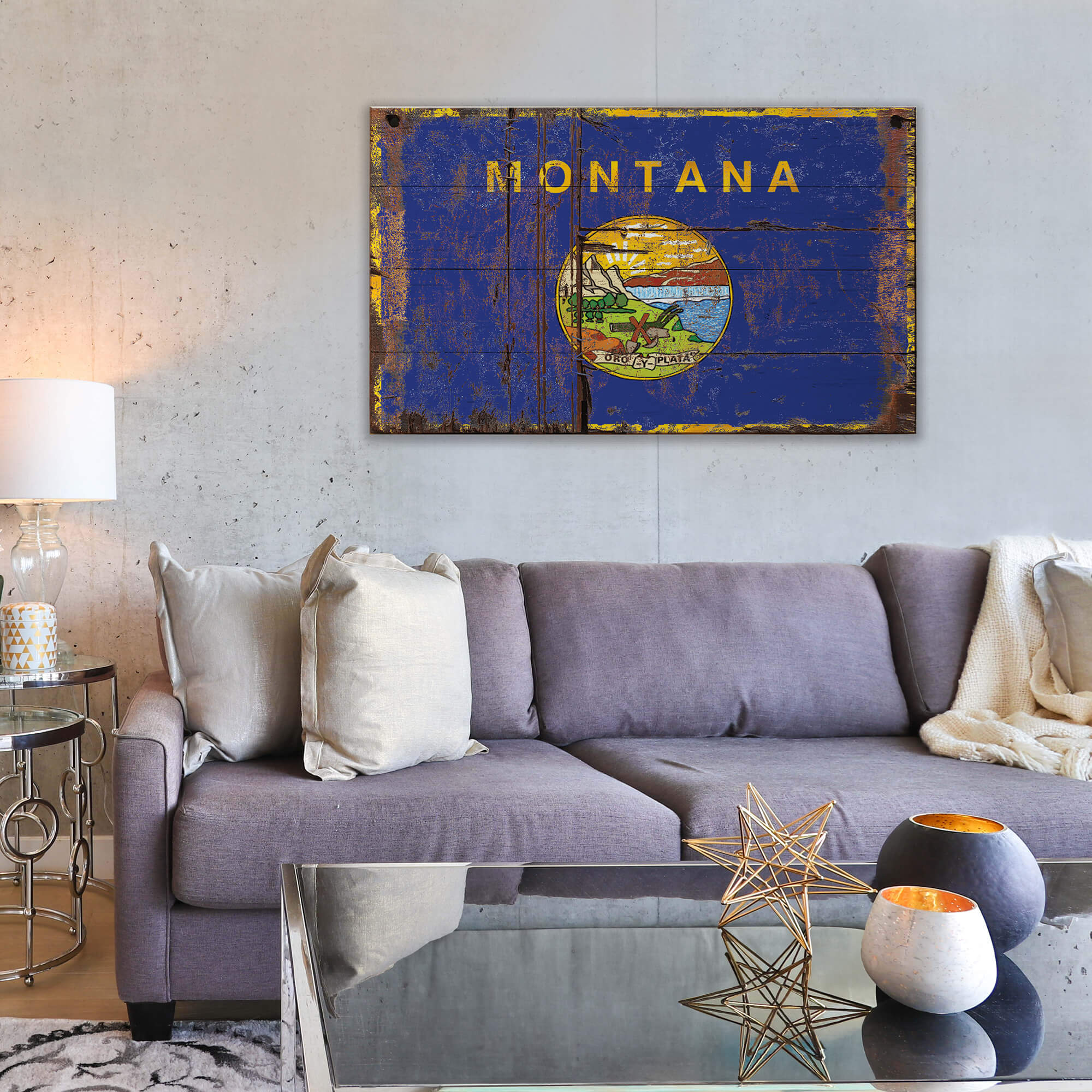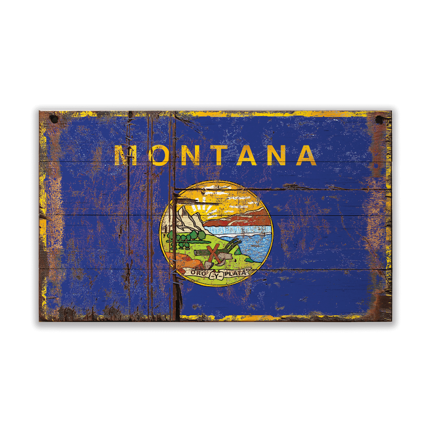 Celebrate your Montana roots with this rustic take on the Treasure State flag. Featuring a weathered, distressed finish that mimics the look of aged wood and decades of sun and wear, this artwork highlights the bold state name and the colorful Great Seal of Montana. The “Oro y Plata” banner pays homage to Montana’s gold and silver mining legacy, while the scenic emblem showcases mountains, plains, forests, and tools of the trade. A timeless tribute to Big Sky Country—perfect for cabins, bars, or anyone proud to call Montana home.