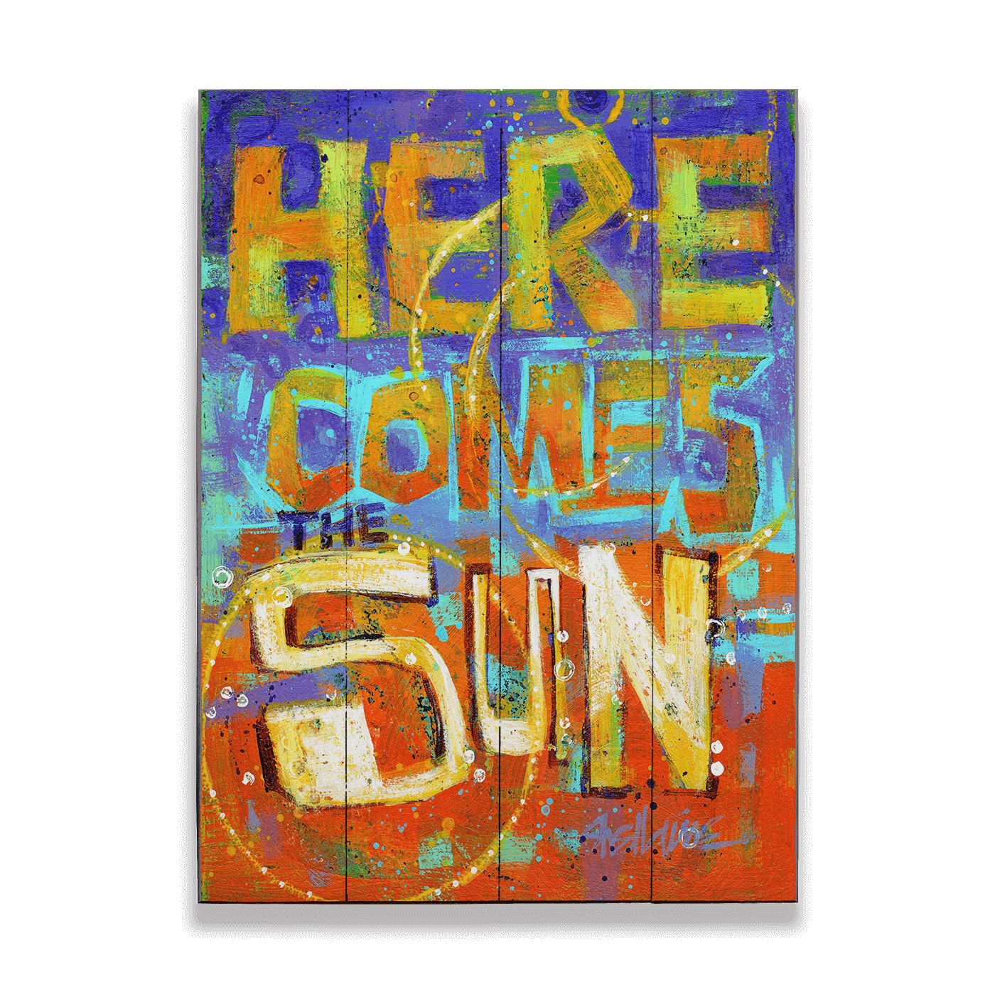 This vibrant and energetic artwork bursts with optimism, featuring the bold declaration, "HERE COMES THE SUN." The dynamic interplay of warm oranges and yellows with cool blues and purples creates a captivating contrast that evokes the joy of sunrise breaking through a new day. Perfect for inspiring hope and happiness, this piece serves as a powerful reminder of brighter days ahead.