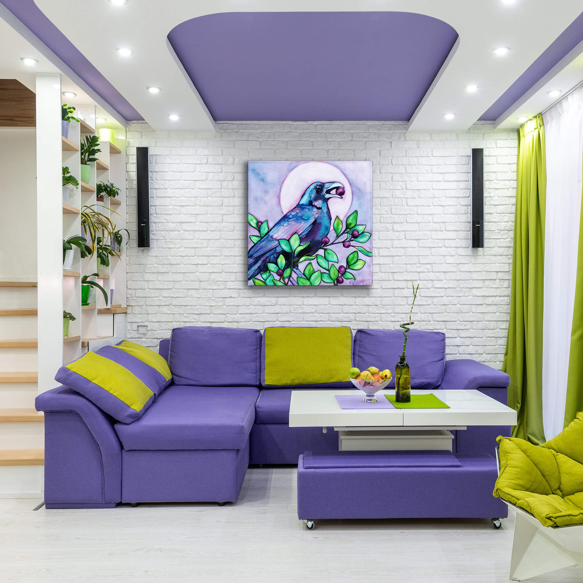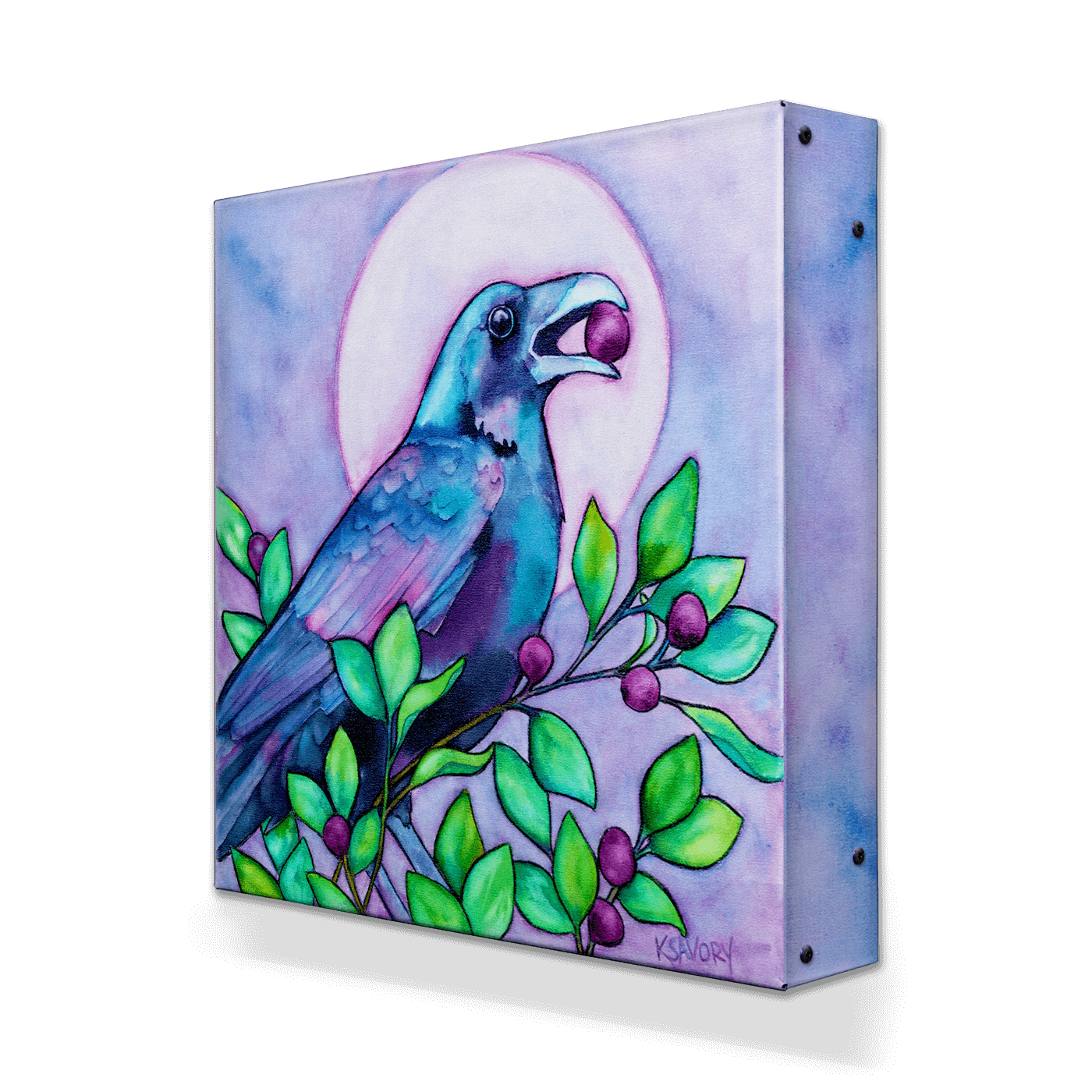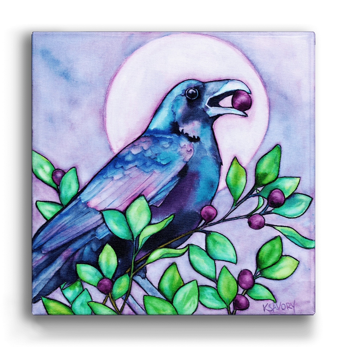 This captivating artwork showcases a crow perched on a huckleberry bush, set against a mystical lavender background. The crow, backed by the glowing moon, brings a sense of intrigue and natural beauty to the piece. Perfect for adding an element of mystery and elegance, this artwork resonates with lovers of wildlife and expressive art.