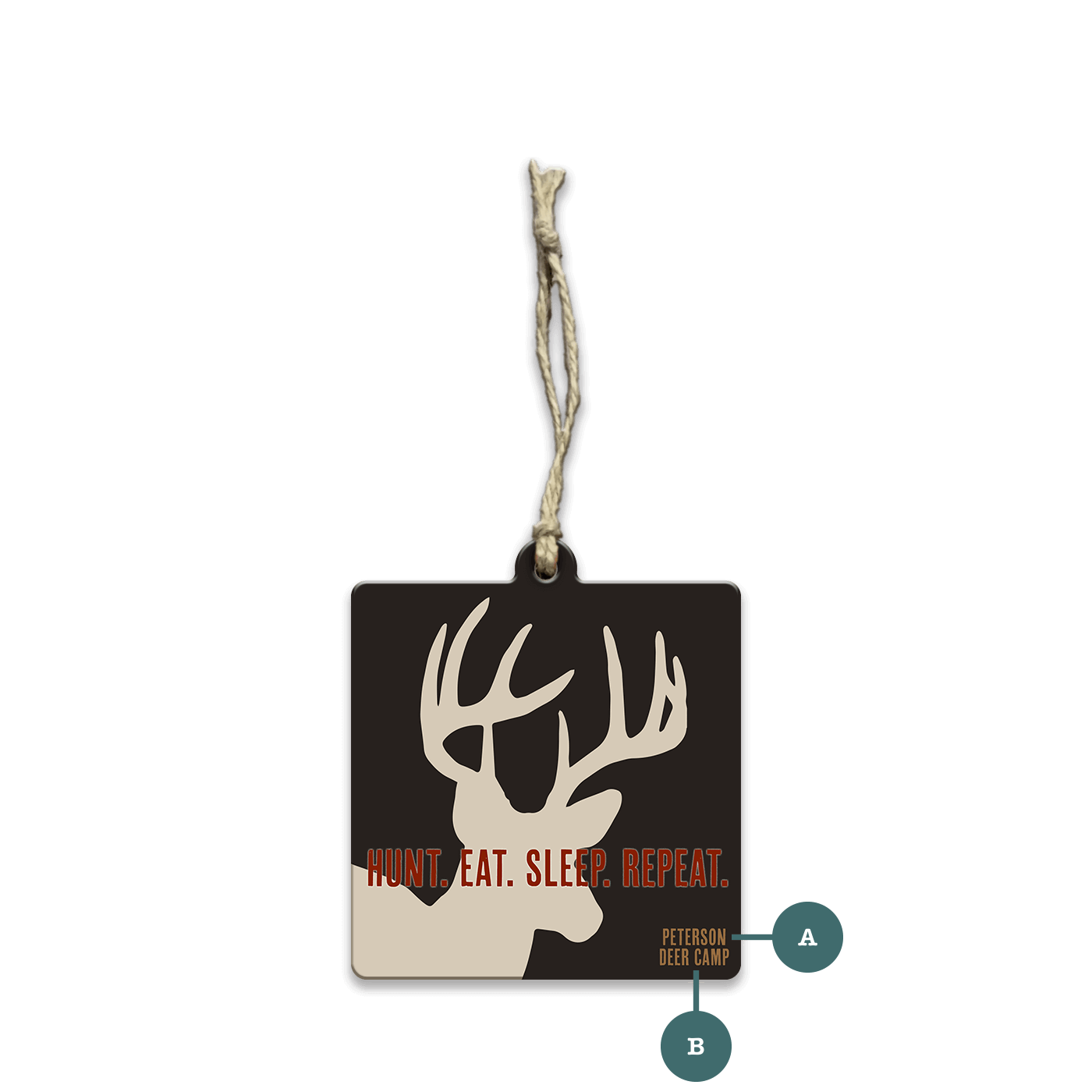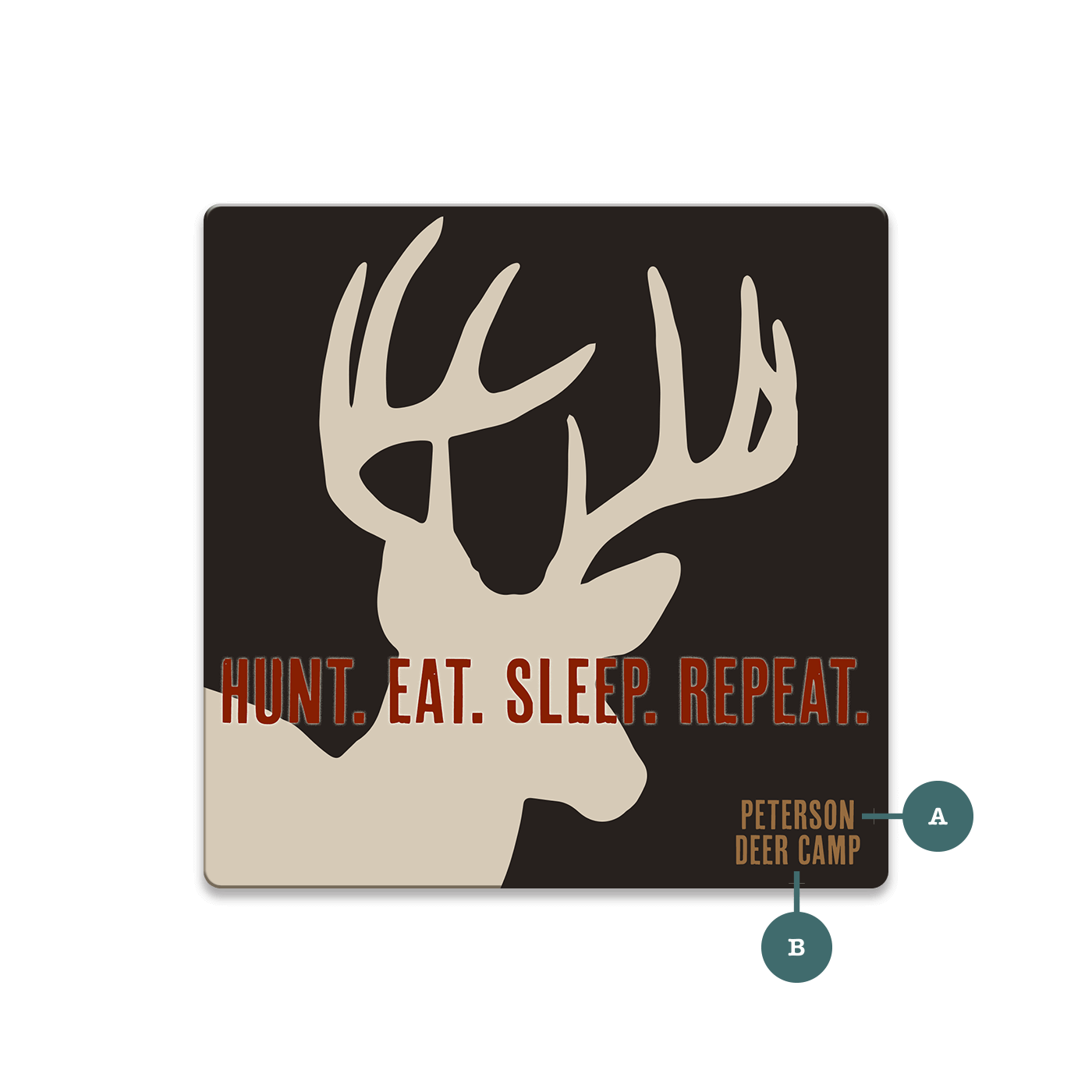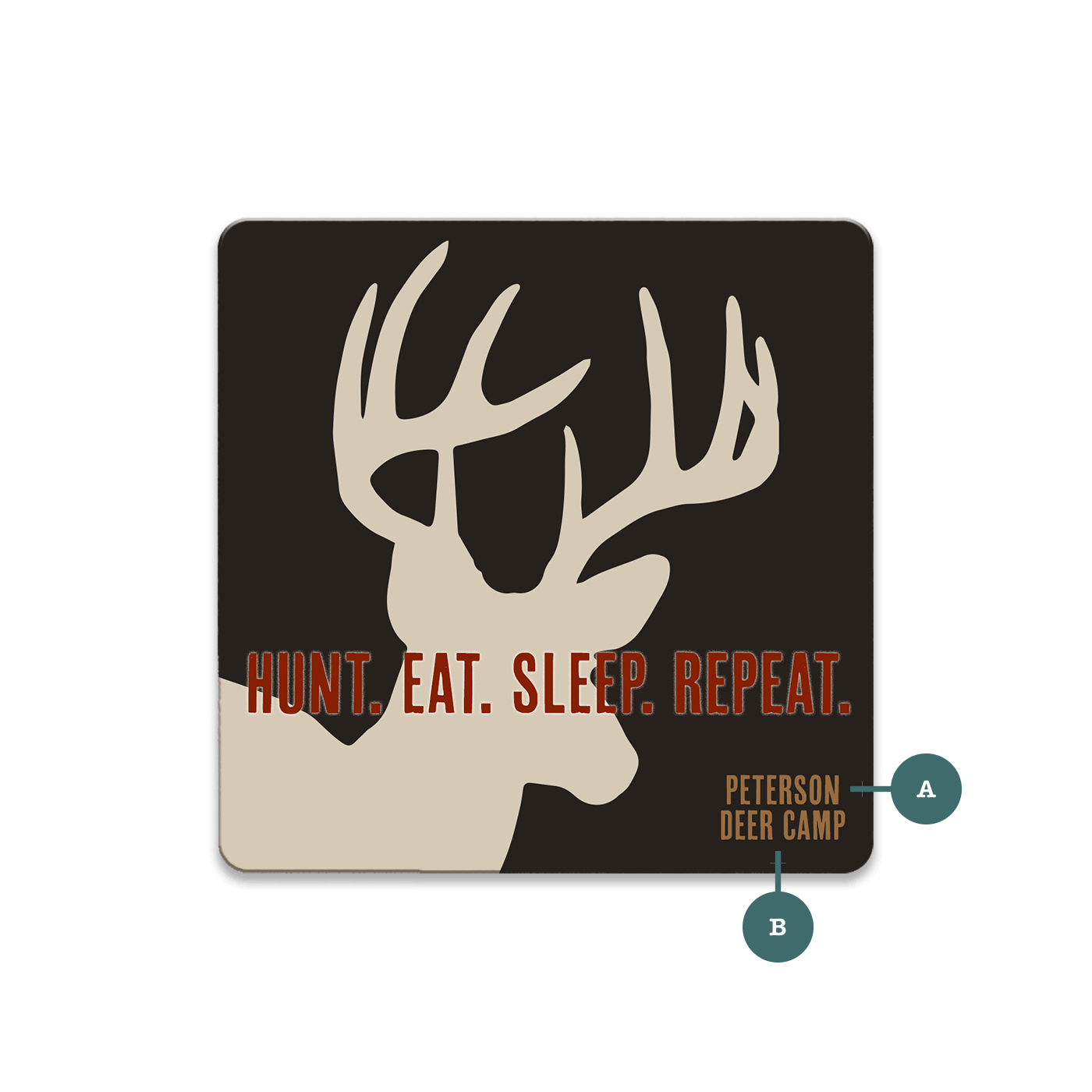 With bold lettering and a crisp silhouette of a trophy buck, this personalized deer camp sign captures the rhythm of hunting season in four simple words: Hunt. Eat. Sleep. Repeat. The distressed background and earthy tones evoke the grit and tradition of time spent in the woods, making it a fitting piece for cabins, lodges, or basements that serve as a seasonal basecamp. Customize the name to give your camp a signature touch—perfect for gift-giving or marking your territory in true outdoorsman style.