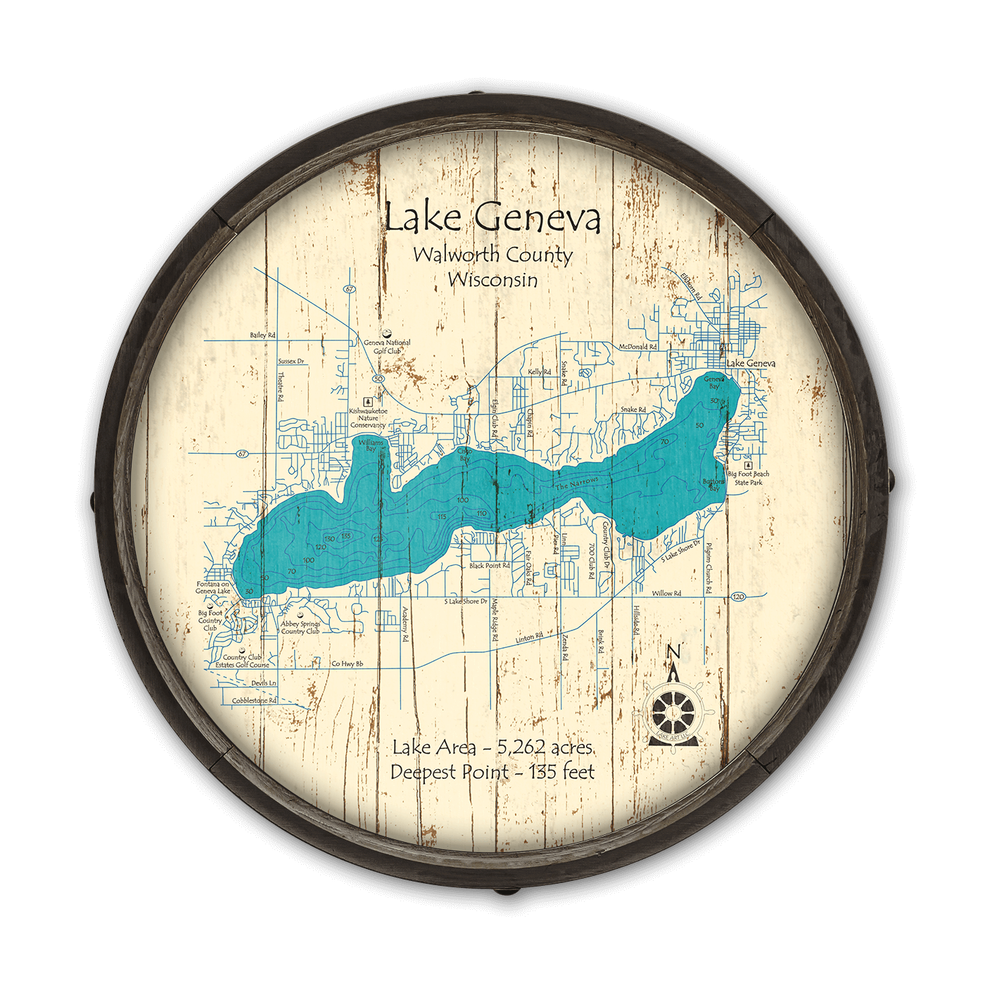Celebrate the iconic charm of Lake Geneva, located in Walworth County, Wisconsin, with this beautifully detailed map featuring the lake’s smooth contours, surrounding streets, and notable shoreline landmarks. Spanning 5,262 acres with a maximum depth of 135 feet, Lake Geneva has long been a favorite Midwest retreat for boating, water sports, lakeside dining, and summer escapes. From elegant estates and public beaches to scenic walking paths and historic charm, the lake offers a rich blend of recreation and relaxation. Whether you're a longtime visitor or simply drawn to its reputation as a premier lake town, this artwork is a timeless way to commemorate the beauty and spirit of Lake Geneva.