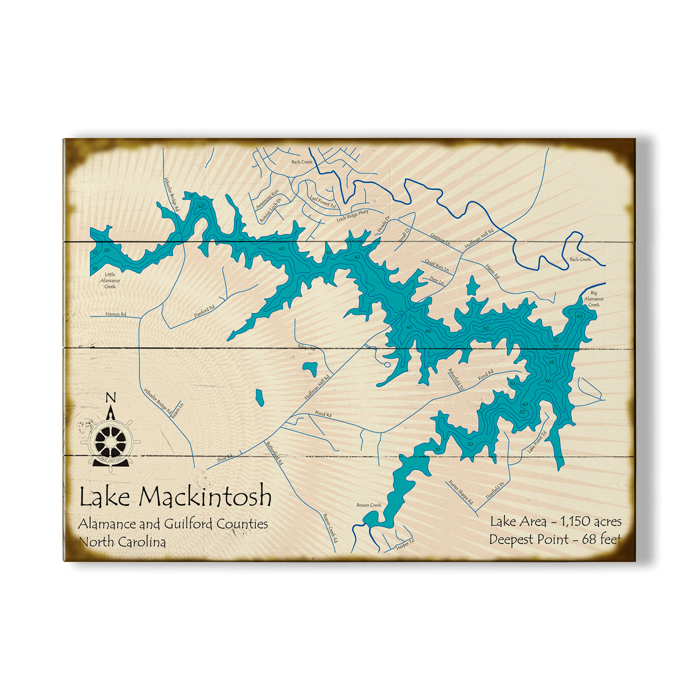 Discover the intricate beauty and natural allure of Lake Mackintosh, a stunning freshwater haven nestled between Alamance and Guilford Counties in North Carolina. This detailed map showcases Lake Mackintosh's expansive waters, spanning approximately 1,150 acres, with a depth reaching up to 68 feet. Known for its meandering shoreline and an array of coves, Lake Mackintosh is a favorite among both water sports and nature lovers.