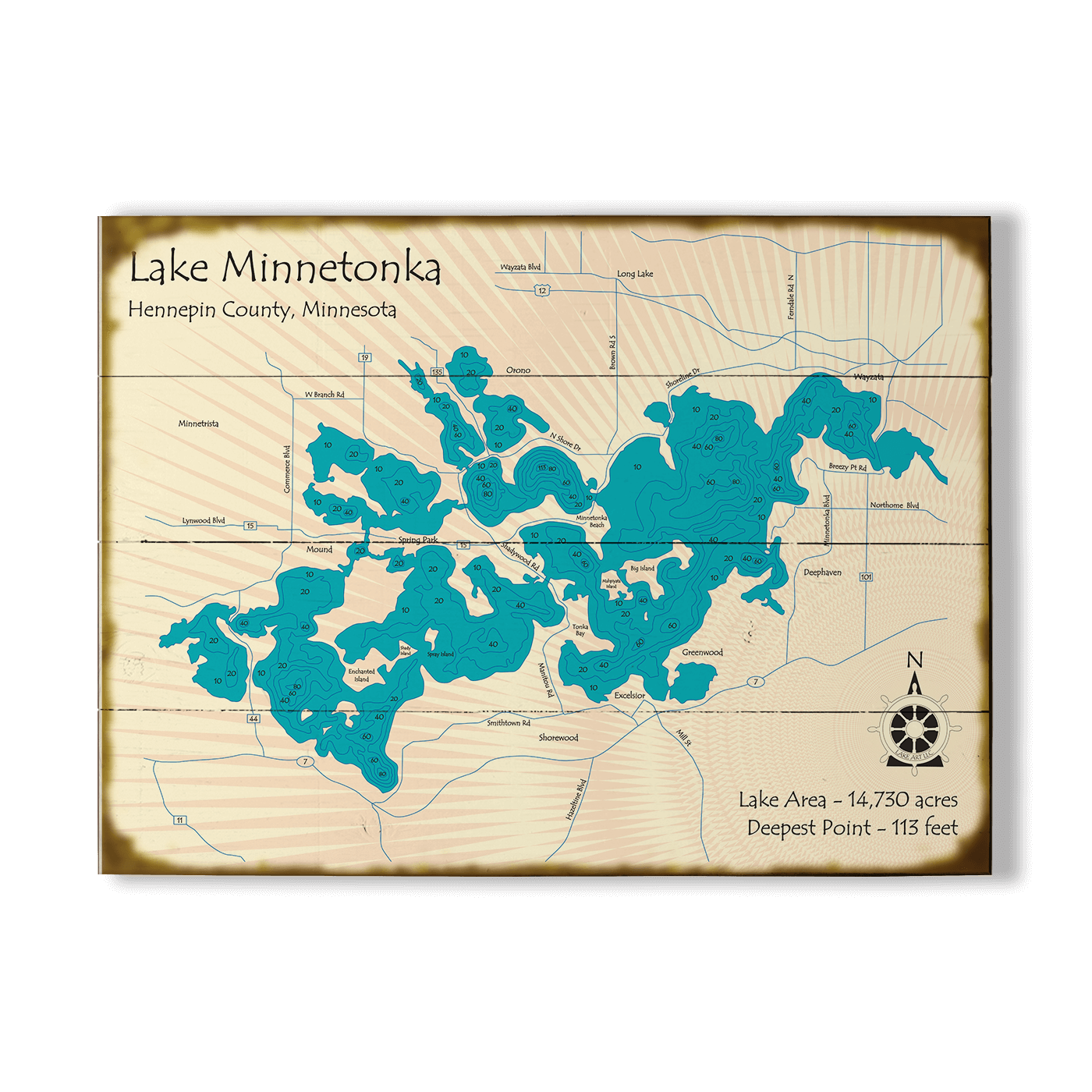 Take a journey back in time and explore the natural beauty and rich history of Lake Minnetonka, Minnesota with this stunning vintage-style map. Lake Minnetonka is a true treasure of the Midwest, offering a wide range of recreational activities that draw visitors from near and far. Lake Minnetonka's rich history dates back to the early 1800s, when it was a major transportation hub for the region, and it played a significant role in the development of Minnesota as a state.