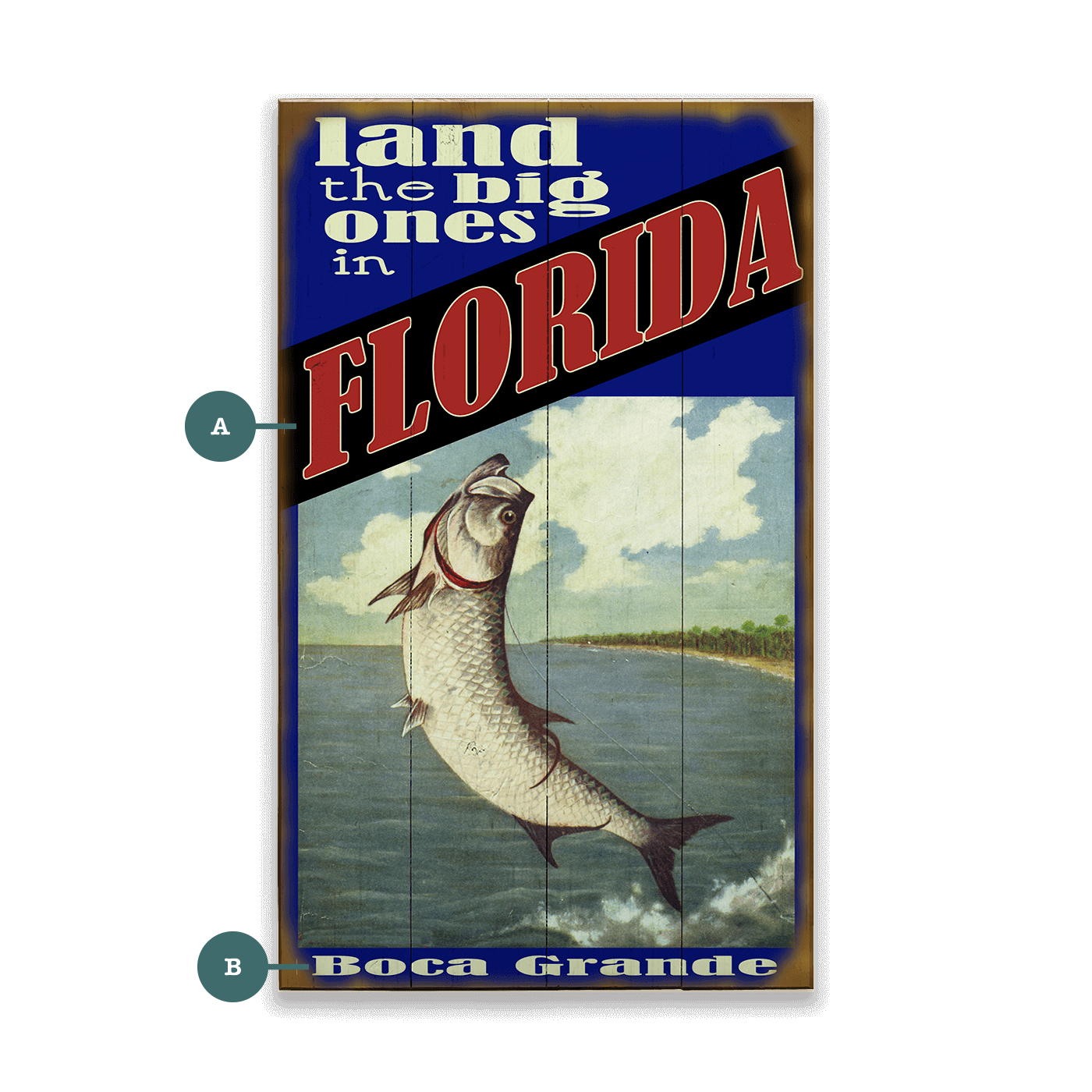 Dive into the excitement of tarpon fishing with this vibrant vintage-style artwork. Depicting a dramatic scene of a tarpon leaping from the water, this piece captures the intensity and thrill of the catch. Perfect for coastal homes or any space with a nautical theme, this artwork brings the adventure of tarpon fishing to life.