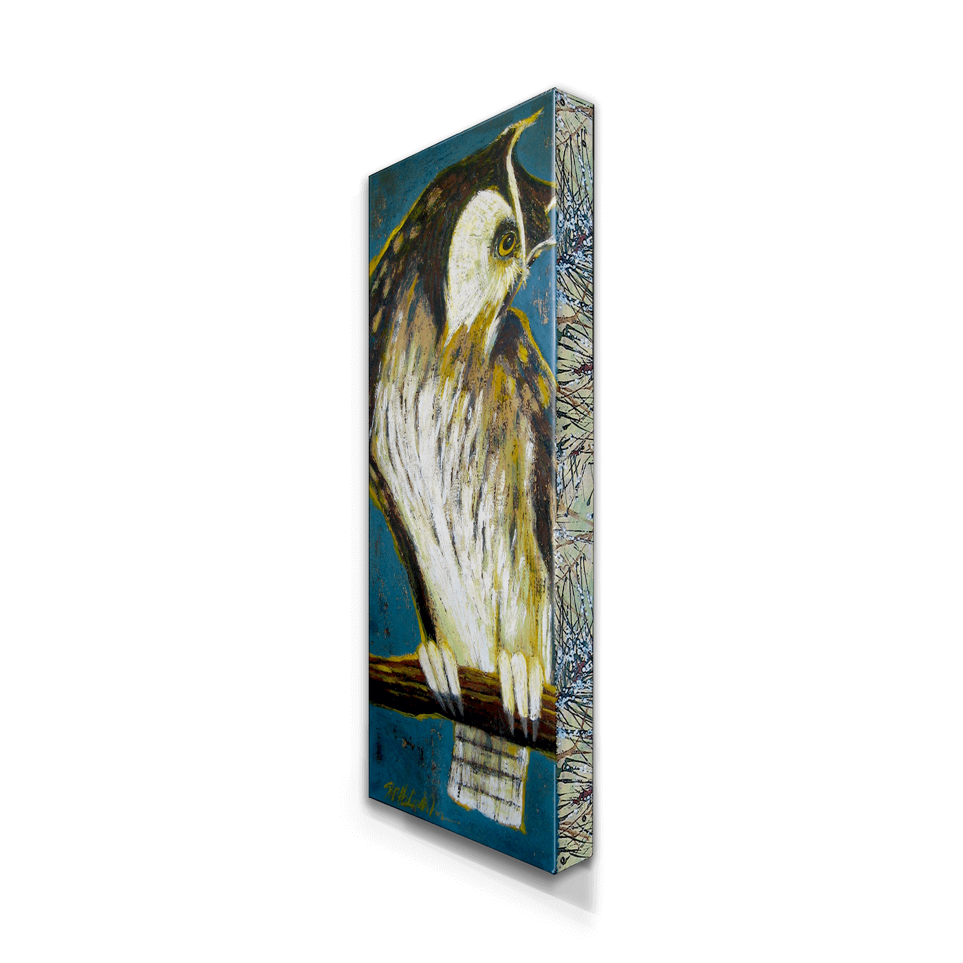 This captivating artwork portrays a watchful owl perched gracefully against a deep blue background, its head slightly turned as if listening intently. The intricate detailing captures the owl's sharp gaze and elegant form, evoking a sense of quiet strength and mystery. Perfect for lovers of wildlife and evocative art, this piece brings a sense of calm and focus to any space.
