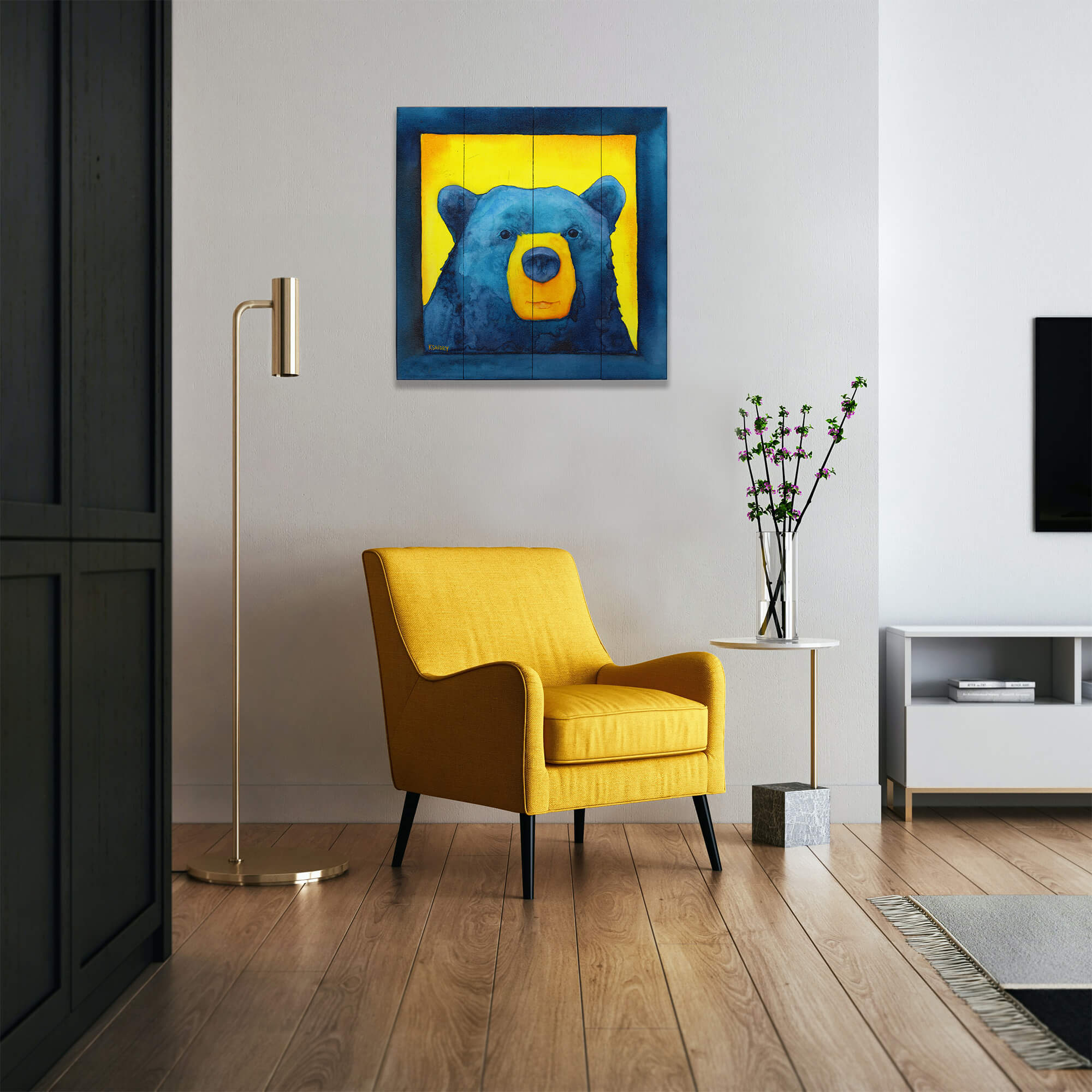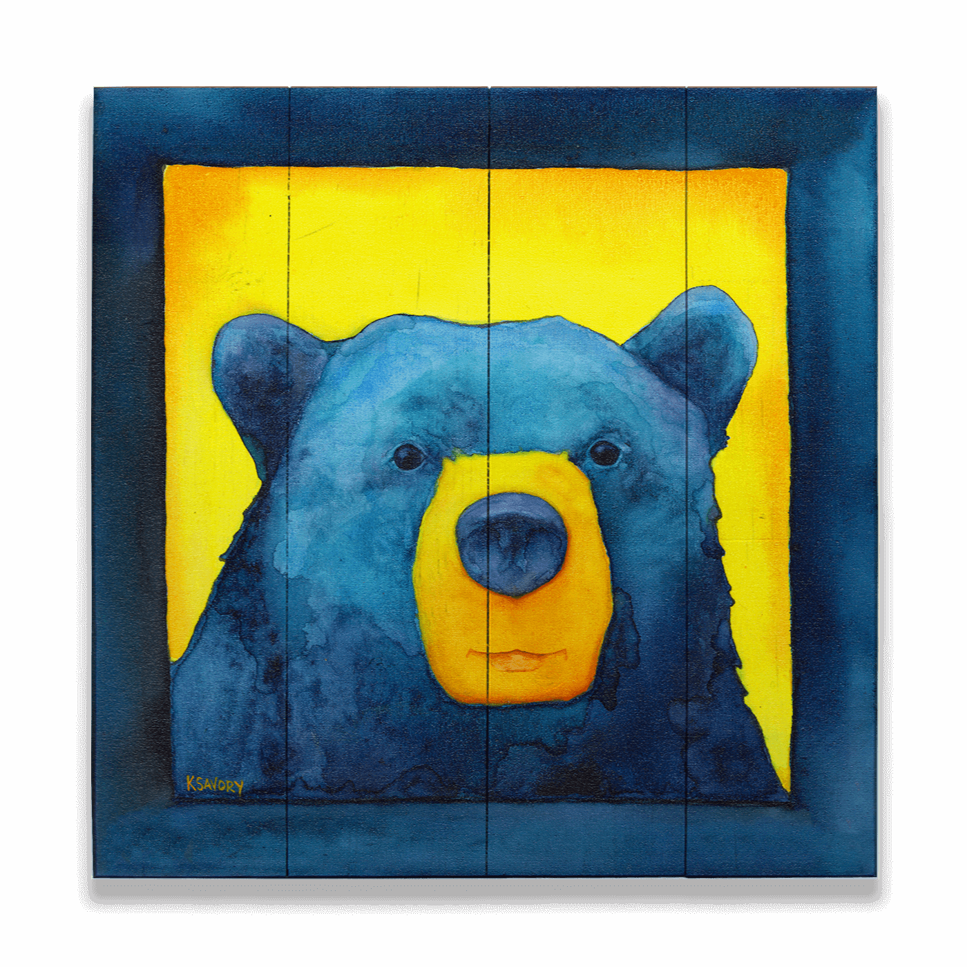 Dive into the captivating essence of the wilderness with this striking bear portrait. Bold and expressive, this artwork uses deep blue and vibrant yellow watercolors to bring the majestic bear to life against a luminous backdrop. Ideal for nature lovers or those seeking to add a touch of the wild to their decor, this bear painting is perfect for creating a serene yet powerful atmosphere in your home or office.