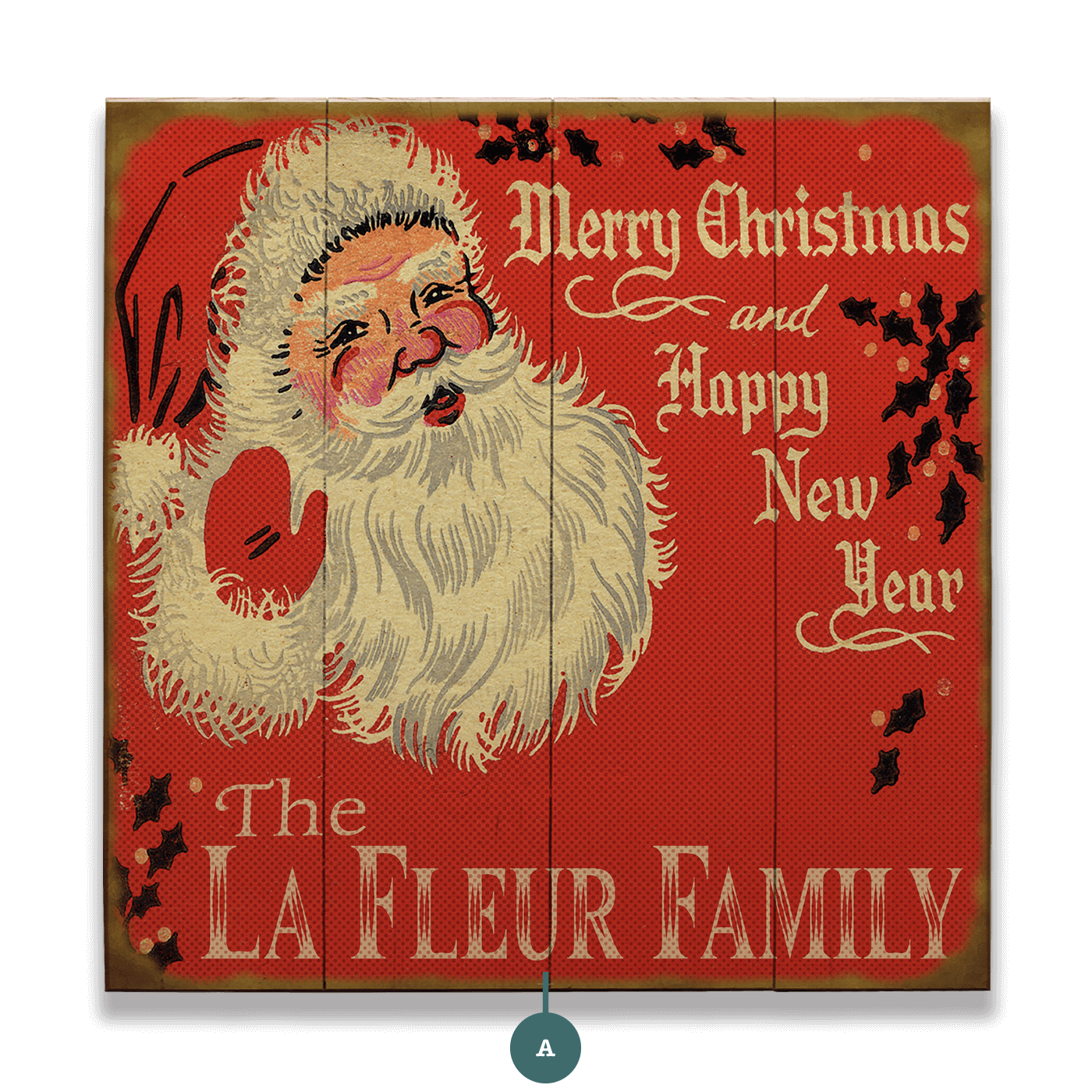 Bring festive cheer to your holiday décor with this nostalgic Santa sign, designed to evoke the warmth and charm of a vintage matchbook cover. Featuring a jolly, rosy-cheeked Santa Claus with his classic red hat and flowing beard, the artwork is set against a bright red background adorned with holly and weathered edges. Elegant lettering delivers a heartfelt “Merry Christmas and Happy New Year,” along with space to personalize your family name for a warm, welcoming touch. Perfect for entryways, living rooms, or holiday gatherings, this piece adds timeless magic to the season.