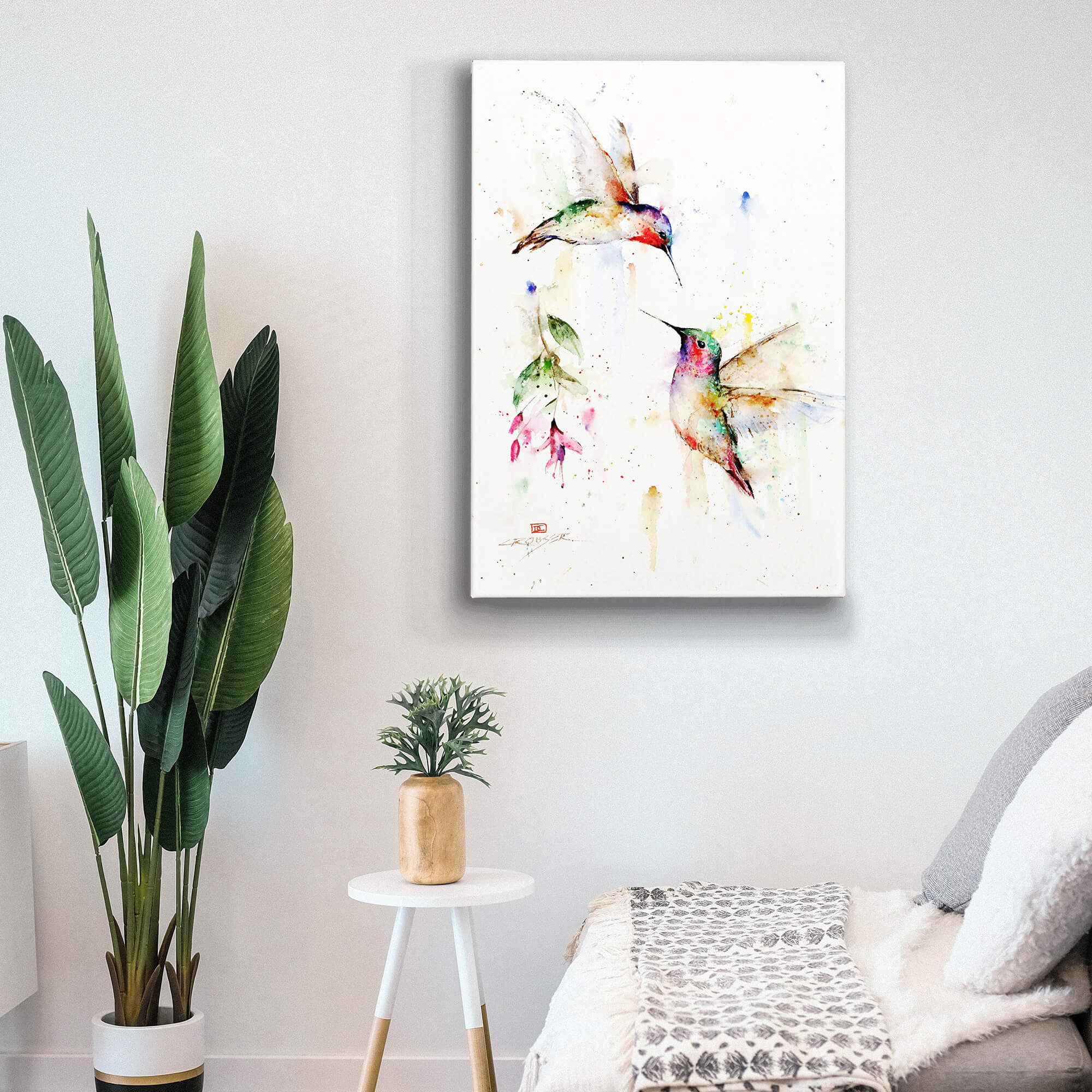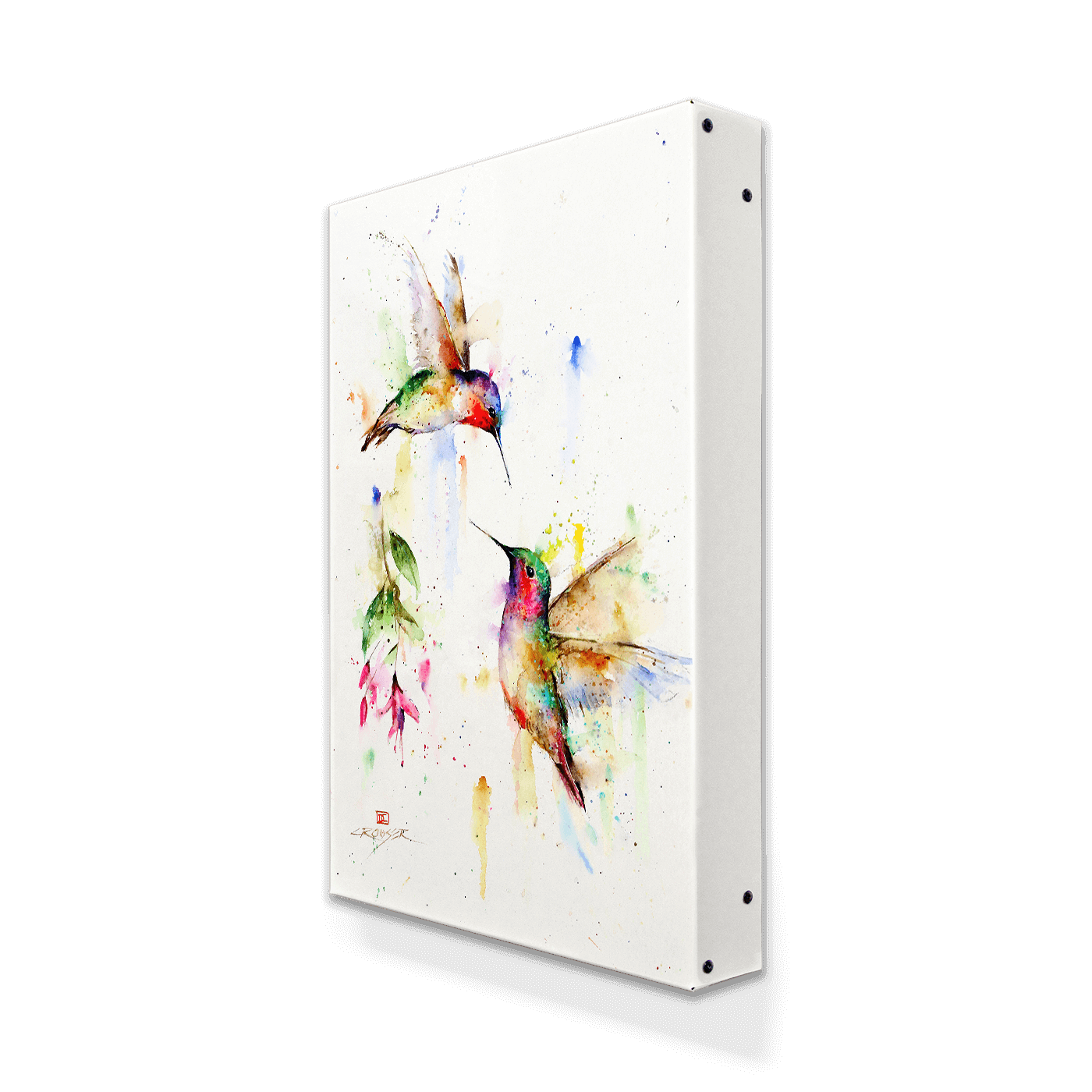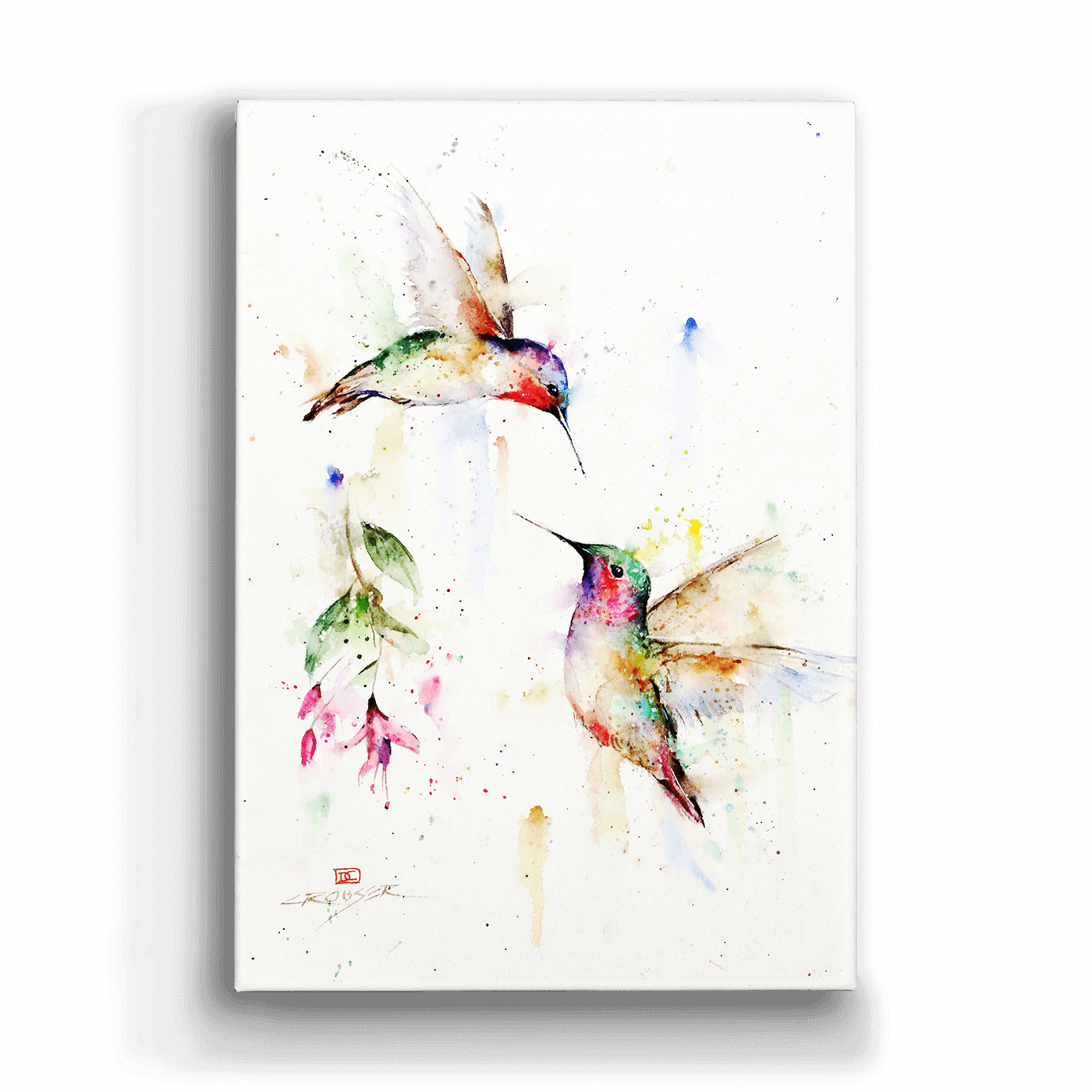 In a secluded grove, two tiny hummingbirds meet in a flurry of motion and color, their iridescent feathers flashing in the dappled light. The secret rendezvous is captured in this stunning watercolor painting that expertly conveys the birds' grace and beauty. The artist's use of delicate brushstrokes and soft colors creates a sense of the birds' intimacy and tenderness, as they share a moment of connection and trust.