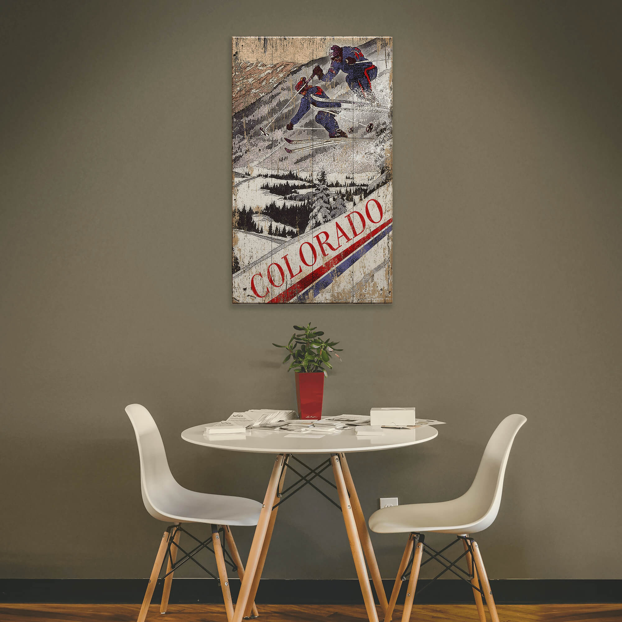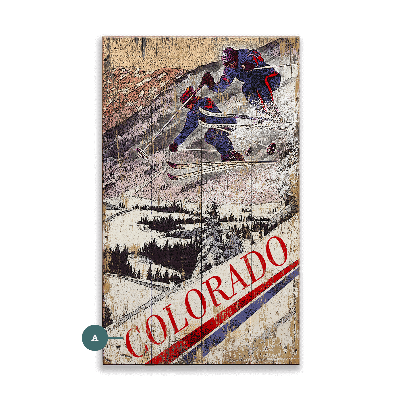 Experience the thrill of vintage ski culture with this striking artwork featuring two skiers in action against a rustic, snowy mountain backdrop. The retro design captures the energy of downhill skiing, making it a perfect addition to any winter sports enthusiast’s collection. This piece can also be personalized with a custom location, adding a unique touch to your home décor.