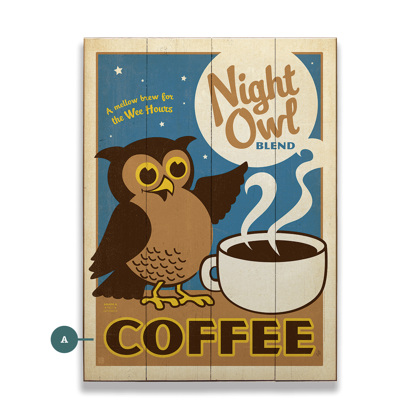 For those who find their muse under the moonlit sky, the 'Night Owl Coffee' print is the perfect companion. This charming artwork celebrates the serene energy of the late hours with a wise owl standing guard over a steaming mug of coffee. Touted as "a mellow brew for the wee hours," this piece is sure to resonate with night-time thinkers, creators, and anyone who enjoys the quiet of the night. The cool, star-speckled background and earthy tones provide a soothing visual that's ideal for study nooks, home offices, or the walls of a cozy café.