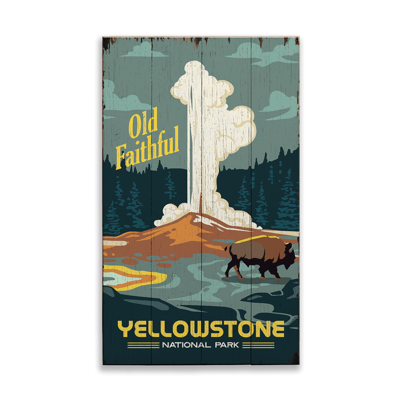 Celebrate two of Yellowstone’s most iconic sights in one scene: the powerful eruption of Old Faithful and the silhouette of a lone bison roaming the steaming ground. With bold, stylized illustration and retro-inspired typography, this artwork captures the raw beauty and legendary character of America's first national park. Perfect for park lovers, cabin decor, or anyone drawn to the wonder of geysers and wildlife, this piece brings the spirit of Yellowstone into your space with vintage flair and timeless charm.