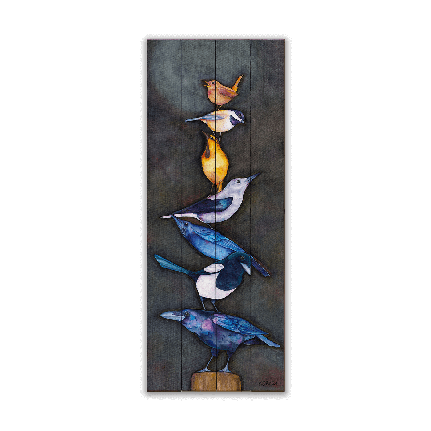 Bring the beauty of the avian world into your home with this imaginative and captivating design showcasing a whimsical tower of colorful birds. From the tiny, earth-toned wren perched on top to the regal, deep blues of the magpie and crow at the base, each bird adds its unique charm to the composition. With the vibrancy of the birds set against a moody, dusky background, this piece is perfect for nature lovers and bird enthusiasts alike.