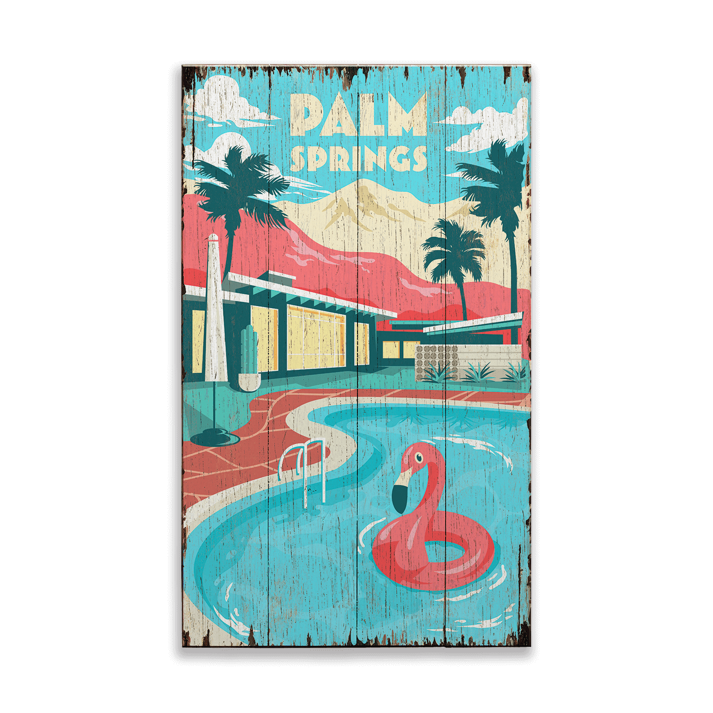This retro-inspired artwork captures the laid-back vibe of a Palm Springs poolside retreat, complete with mid-century architecture, palm trees, and a playful flamingo float. The bold, vibrant colors and nostalgic design make it a perfect addition to any space that celebrates vintage charm or poolside living. Ideal for creating a warm, tropical atmosphere in your home, office, or outdoor space.