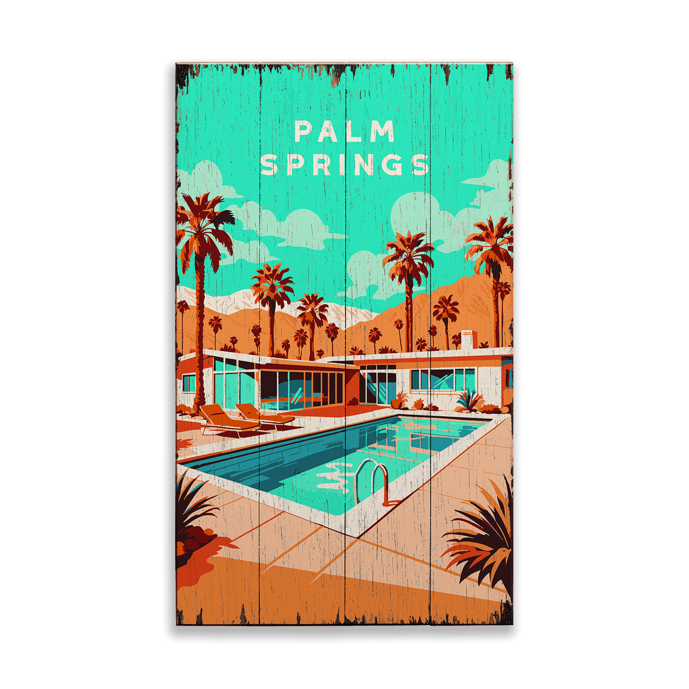 Palm Springs Pool Scene: Distressed Finish - Wood & Metal Wall Art
