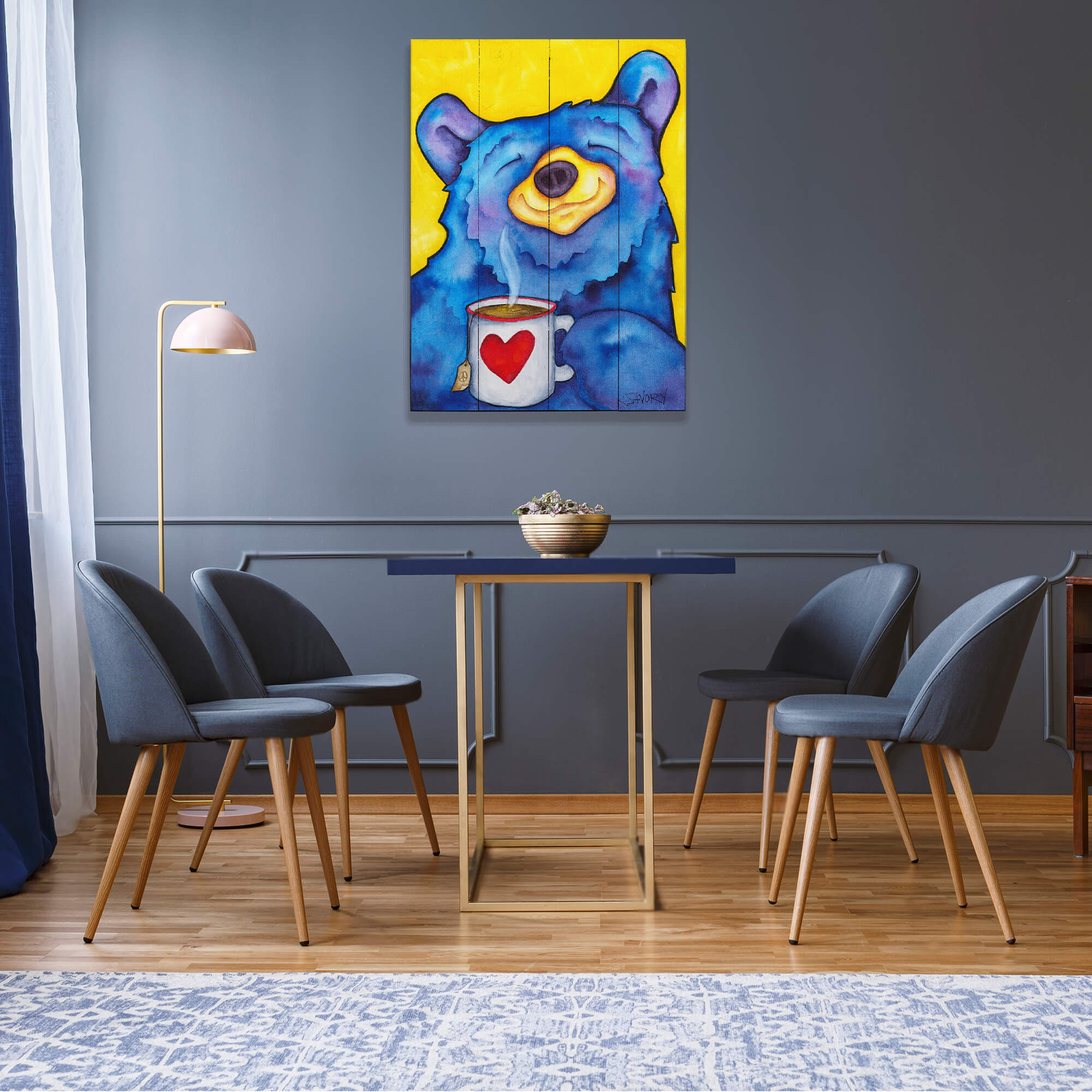 This captivating watercolor painting features a joyful blue bear enjoying a steaming cup of tea. Set against a vivid yellow background, this artwork exudes warmth and happiness, highlighted by the cheerful expression of the bear and the inviting red heart on the mug. The playful combination of colors and the comforting scene create a feeling of coziness and contentment, perfect for brightening up any room. This piece is ideal for those looking to add a touch of whimsy and warmth to their home or office, making it a delightful addition to any art collection.