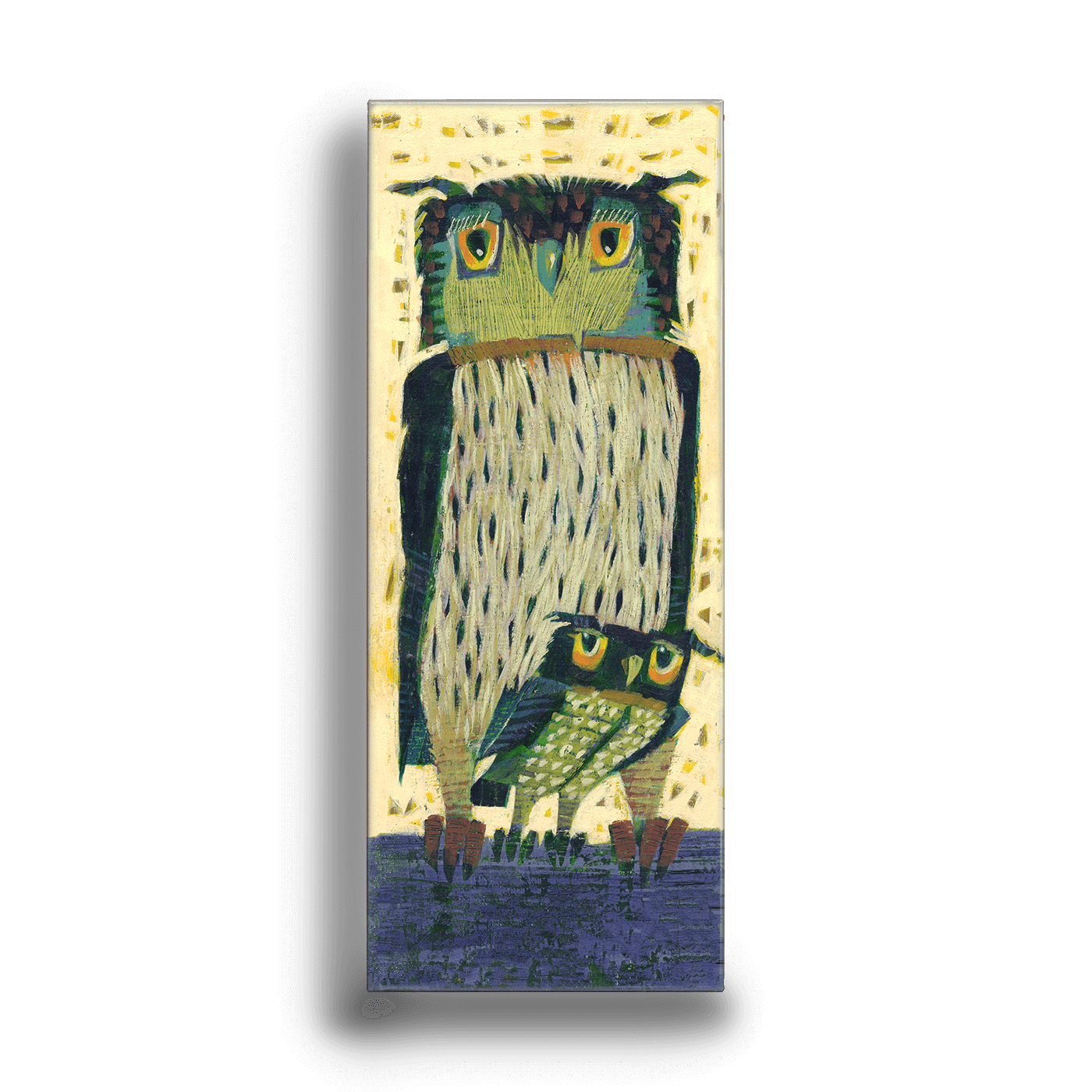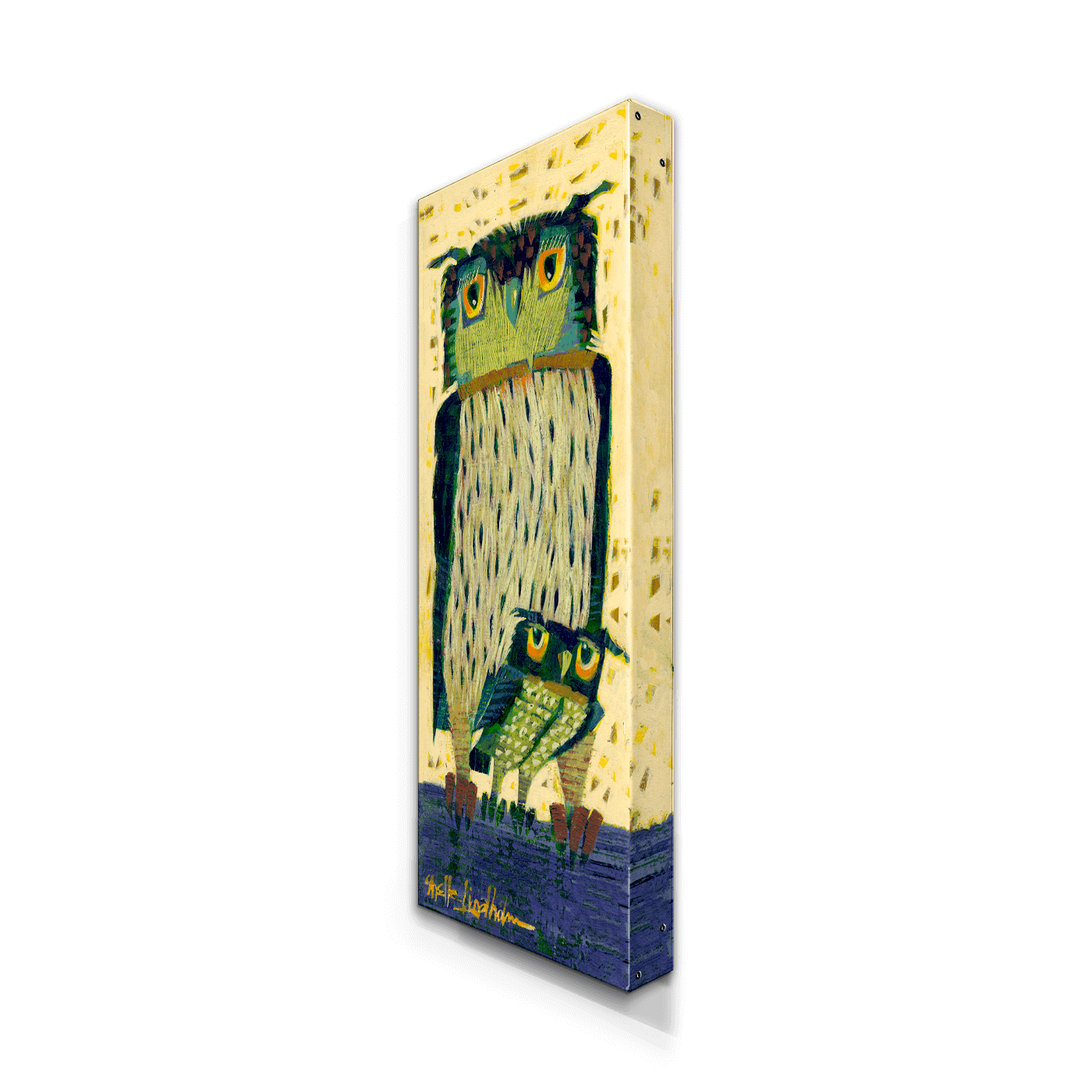 This charming artwork showcases a pair of owls, a large adult and a smaller juvenile, both exuding wisdom and curiosity with their striking, wide-eyed expressions. The textured feathers and rich, earthy hues add depth and personality to the piece, while the bright, abstract background gives it a playful and artistic flair. Ideal for wildlife lovers and art enthusiasts alike, this piece beautifully captures the bond between the two owls in a whimsical, nature-inspired setting.
