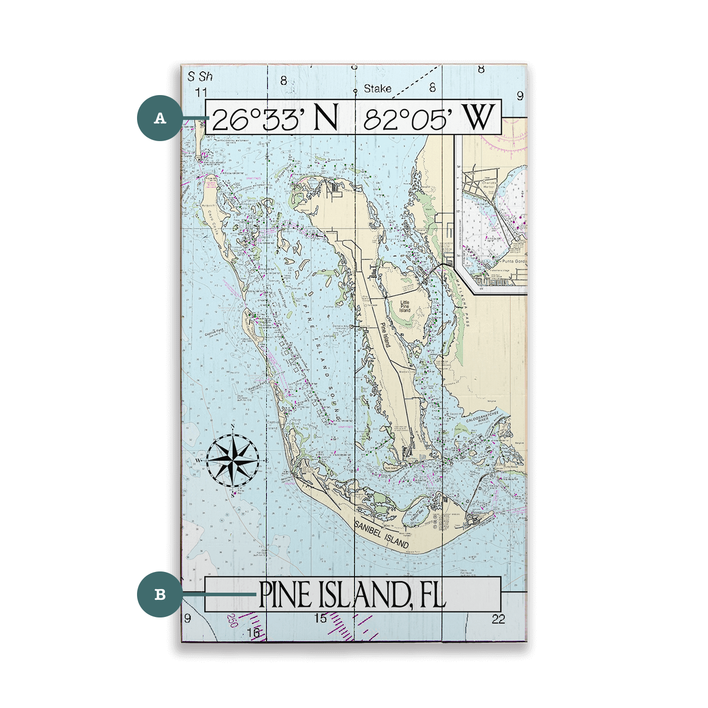 This artwork features a detailed chart of Pine Island, Florida, capturing its expansive shoreline and surrounding waterways. The design includes precise coordinates (26°33' N, 82°05' W) and a decorative compass rose, adding classic nautical style to the piece. Known as the largest island off Florida’s Gulf Coast, Pine Island offers a quieter, more natural setting than nearby barrier islands, with abundant mangroves, fishing villages, and scenic boating routes. Both the name and coordinates can be customized for a personalized touch, making this artwork a perfect way to celebrate the charm and coastal spirit of Pine Island in any space.