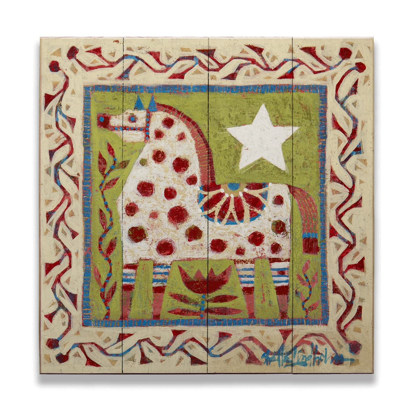 Part of our collection of four Swedish Dala horse-inspired paintings, this delightful artwork features a red-spotted horse and delicate folkloric patterns, set against a rich green background. A bold white star and a blooming tulip add symbolic touches, while the decorative border enhances the piece's natural charm. Full of texture and whimsical detail, this composition celebrates heritage with a playful and timeless touch, perfect for brightening any space.
