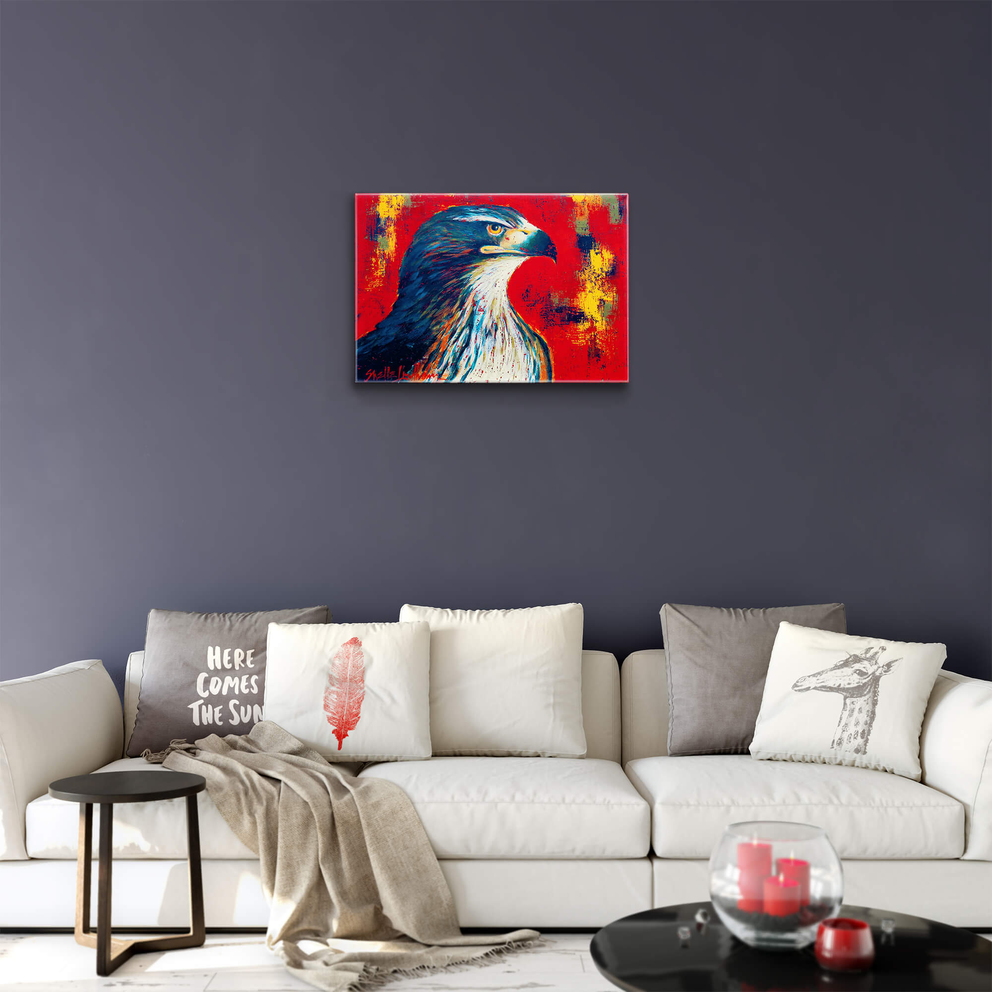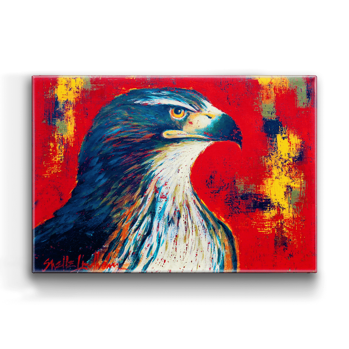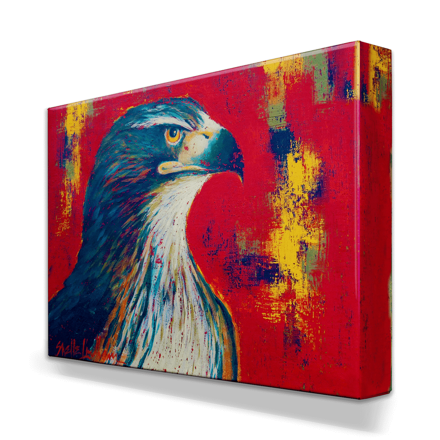 This striking artwork of a red-tailed hawk captures the majesty and intensity of one of nature's most iconic birds of prey. The rich red and yellow background creates a bold, fiery contrast that highlights the hawk's sharp gaze and detailed plumage. With its dynamic brushstrokes and vibrant colors, this piece conveys strength, focus, and the untamed spirit of the wild. Ideal for adding a dramatic and inspiring focal point to any space, this artwork celebrates the beauty and power of the red-tailed hawk in a modern, expressive style.