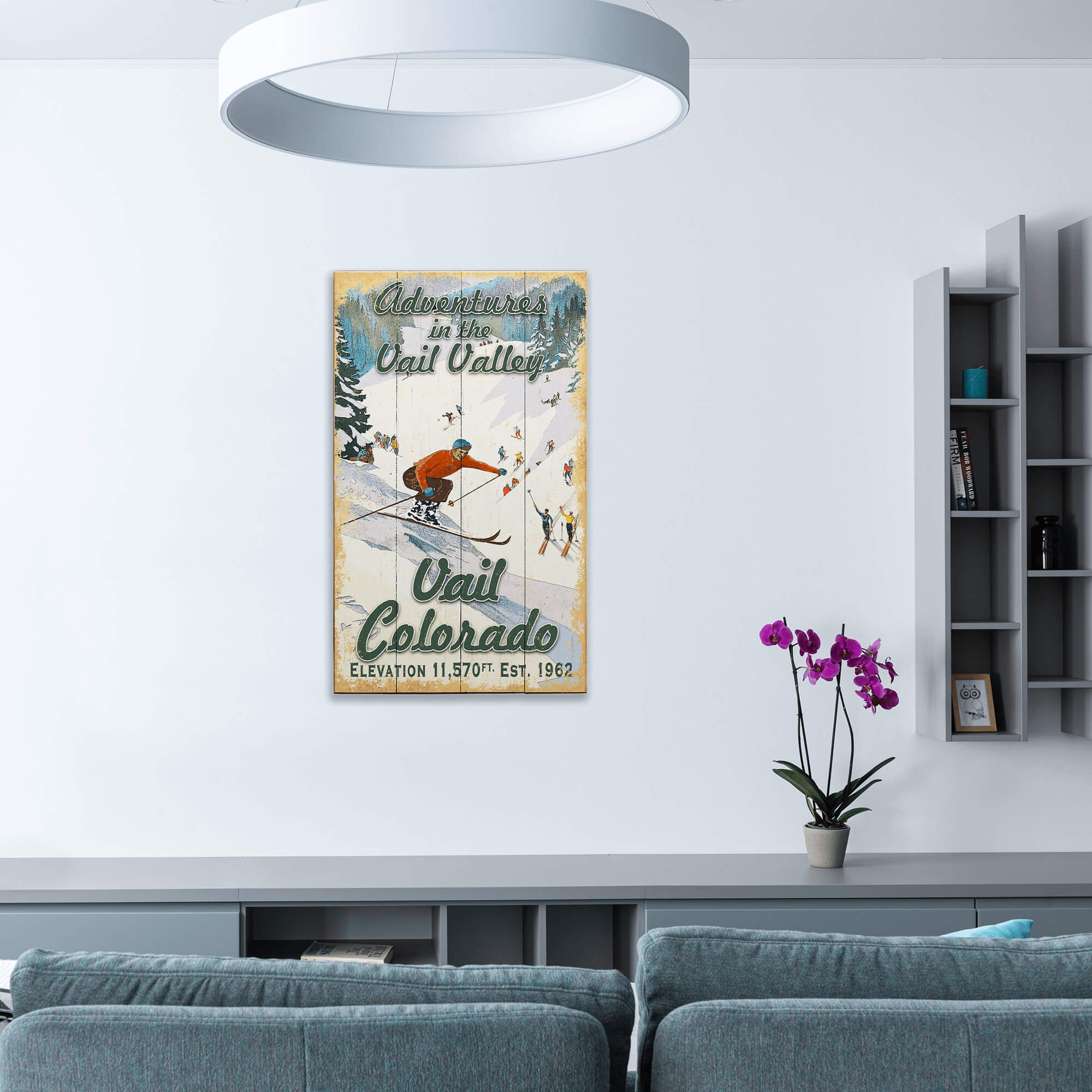 This vintage ski scene captures the excitement of a bustling ski resort, with skiers descending a snowy slope surrounded by winter scenery. The retro-inspired design features vibrant colors and classic typography, evoking the charm of mid-century skiing adventures. Personalization options allow for custom text, making this artwork a great addition to any ski lodge or mountain-themed décor.
