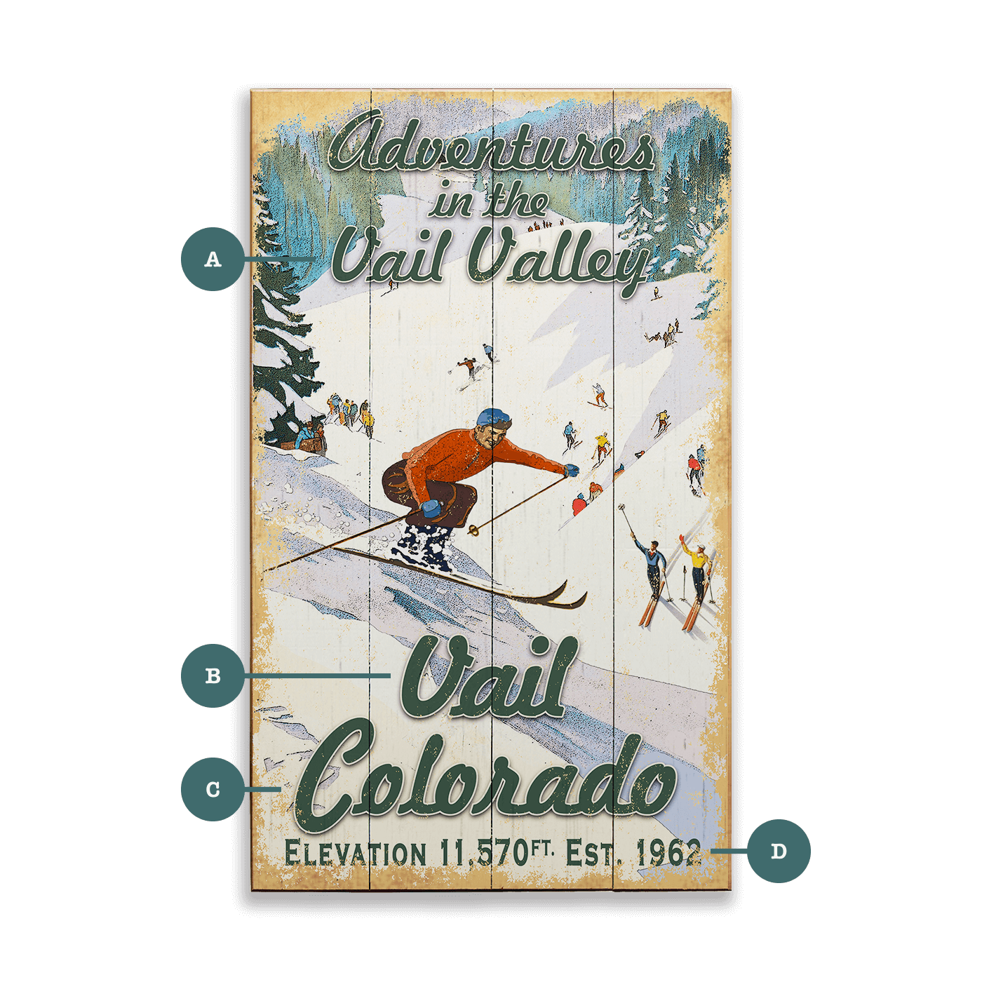 Enjoy complimentary personalization for this piece, meticulously handcrafted by our graphic design team. Specify your desired text for points A, B, C, and D. To ensure perfection in your custom piece, please verify your text carefully. Missing personalization information will revert to our default design as shown. To remove all text from a field, type "Remove" in that field.