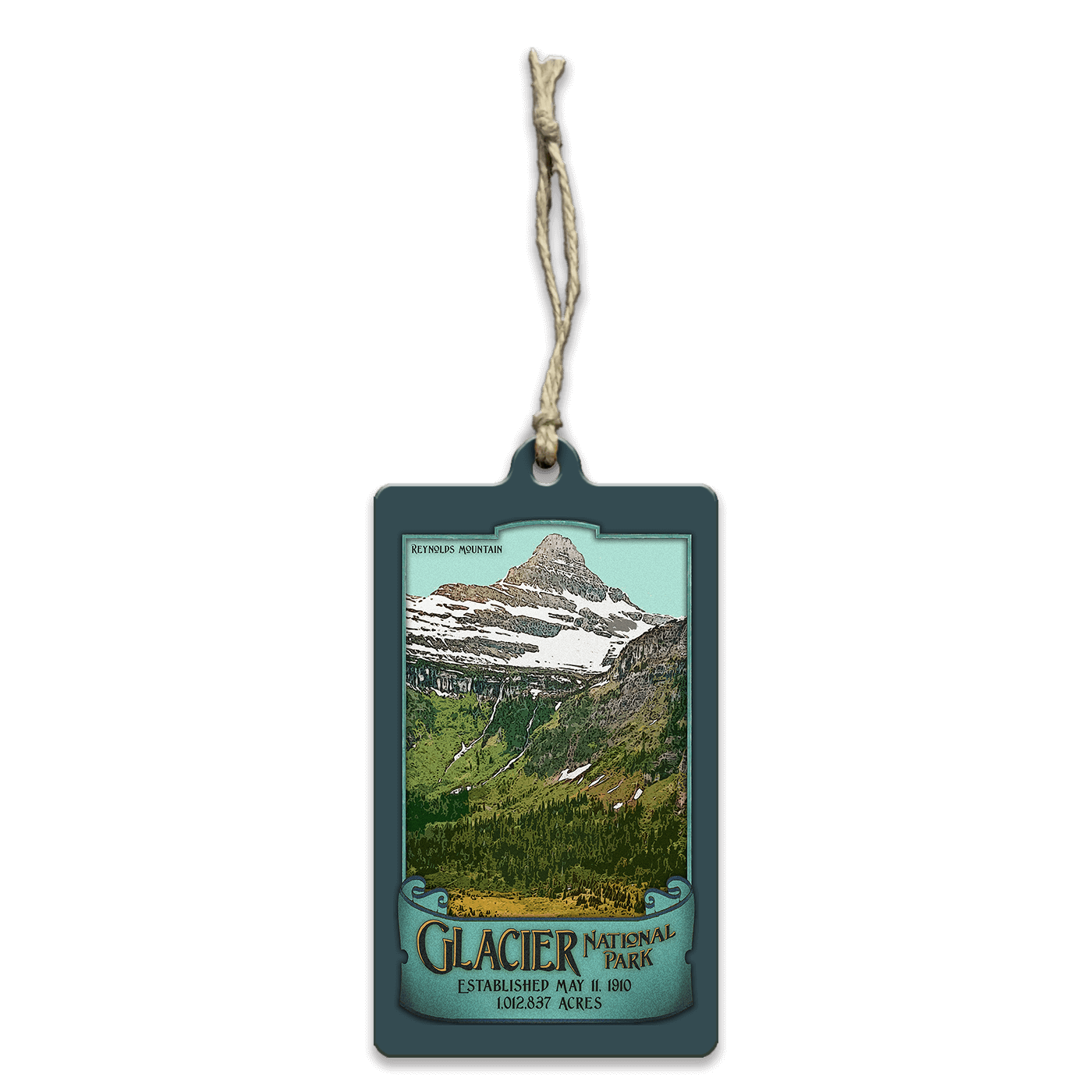 Rendered in a bold, vintage poster style with rich greens, cool blues, and textured detailing, the design evokes classic early national park travel art while highlighting one of Glacier’s most recognizable peaks. A timeless tribute to Glacier’s mountain scenery, this piece is perfect for cabins, lodges, mountain homes, or anyone who holds a special connection to the Crown of the Continent.