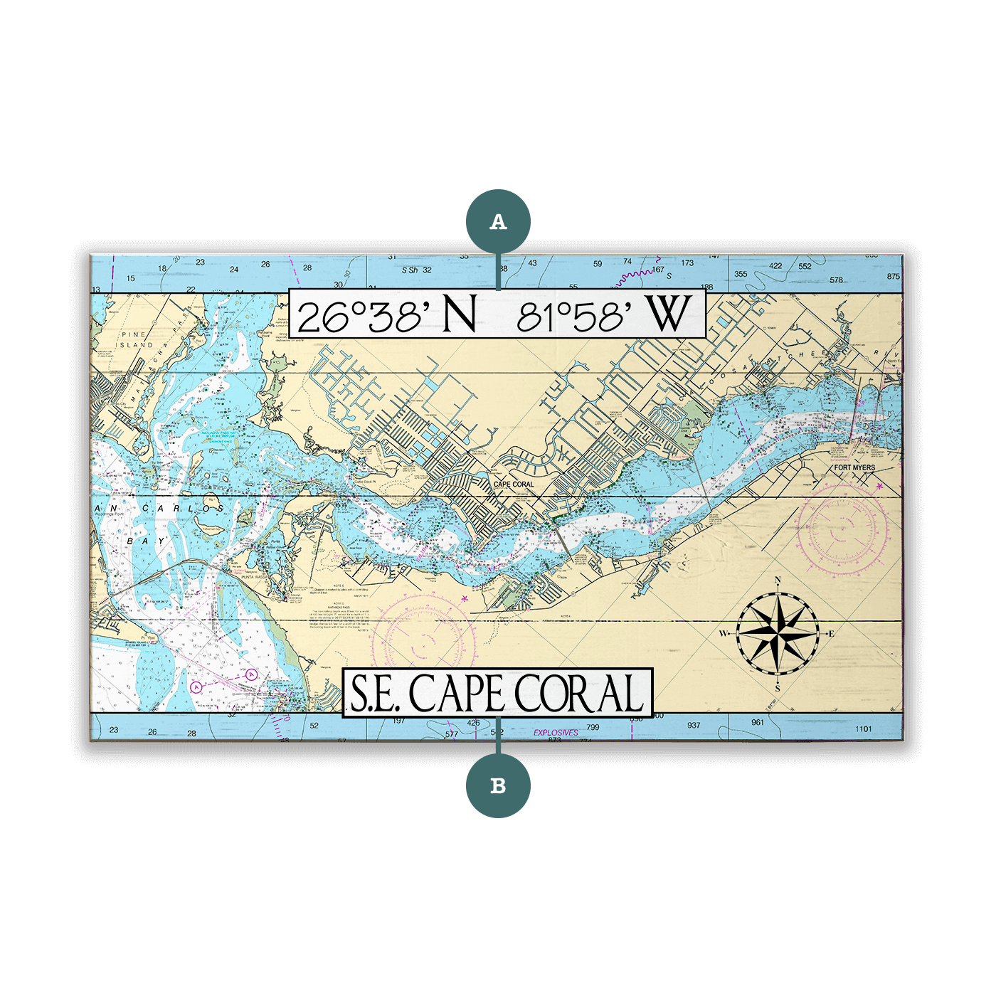This artwork features a detailed chart of Southeast Cape Coral, Florida, highlighting the area's extensive canal system, waterways, and its location along the Caloosahatchee River. The design includes precise coordinates (26°38' N, 81°58' W) and a decorative compass rose, combining technical detail with coastal charm. Known for having more miles of navigable canals than any other city in the world, Cape Coral is a haven for boaters, anglers, and waterfront living. Both the name and coordinates can be customized for a personalized touch, making this artwork a unique and fitting addition to any home, office, or nautical-themed space.