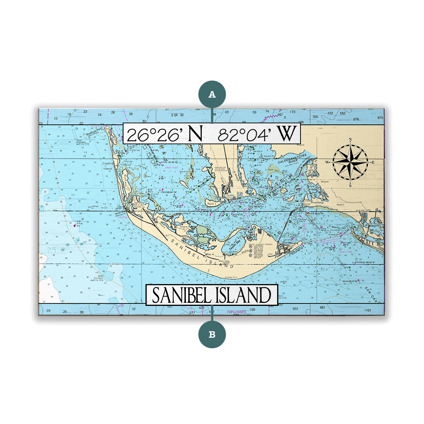 This artwork features a detailed chart of Sanibel Island, Florida, showcasing its shoreline, waterways, and surrounding Gulf waters. The design includes precise coordinates (26°26' N, 82°04' W) and a decorative compass rose, bringing classic nautical style to this coastal representation. Renowned for its shell-covered beaches, abundant wildlife, and natural beauty, Sanibel Island is a cherished destination for beachgoers, boaters, and nature lovers alike. Both the name and coordinates can be customized for a personalized touch, making this artwork a unique way to celebrate the island’s coastal charm in any home, office, or beach-themed space.