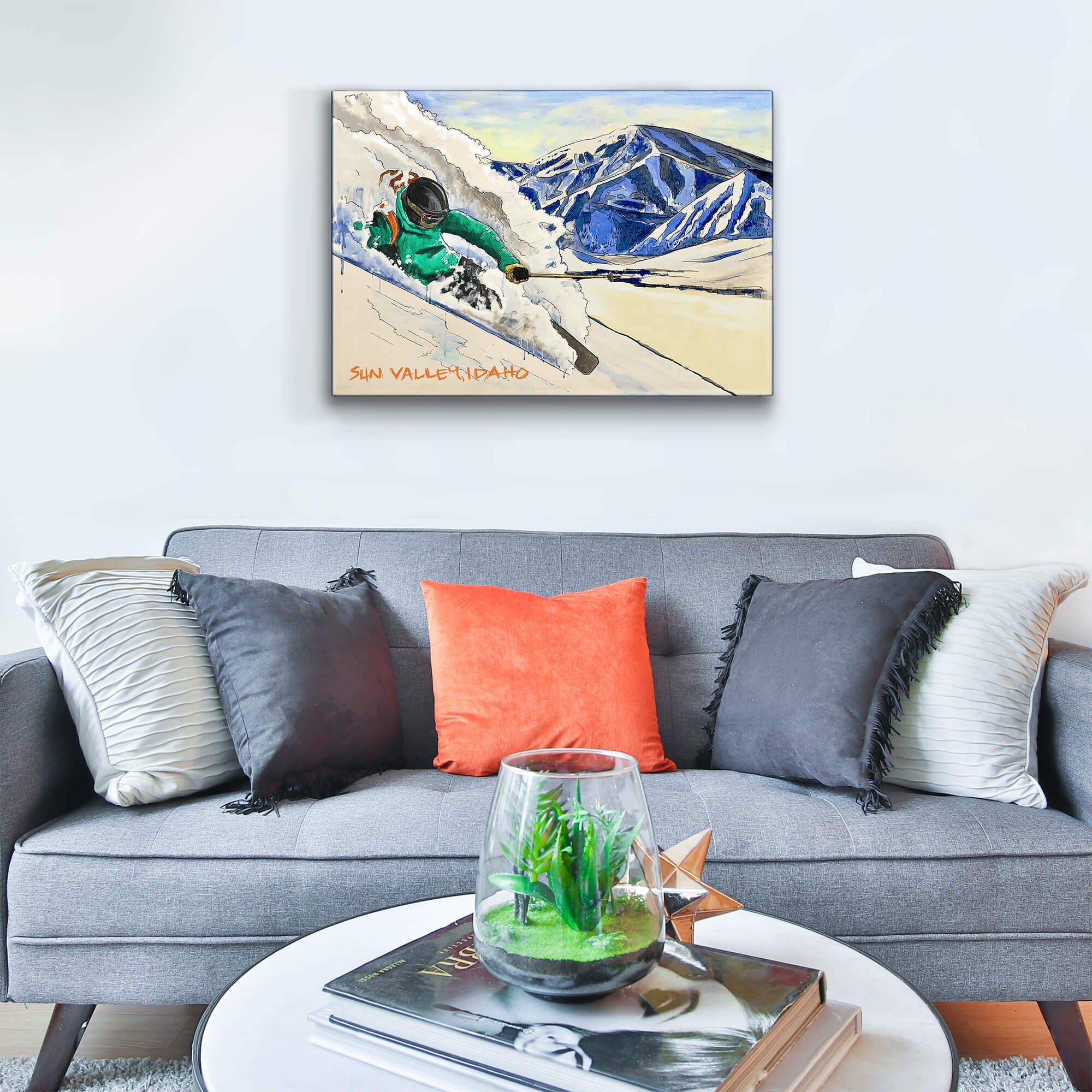Experience the rush of carving down Bald Mountain in Sun Valley, Idaho, with this vivid depiction of a skier cutting through fresh powder. The bold color and energetic brushwork capture the thrill and freedom of a perfect downhill run. A dynamic homage to one of the West’s most legendary ski mountains, it’s ideal for anyone who lives for adventure on the slopes.