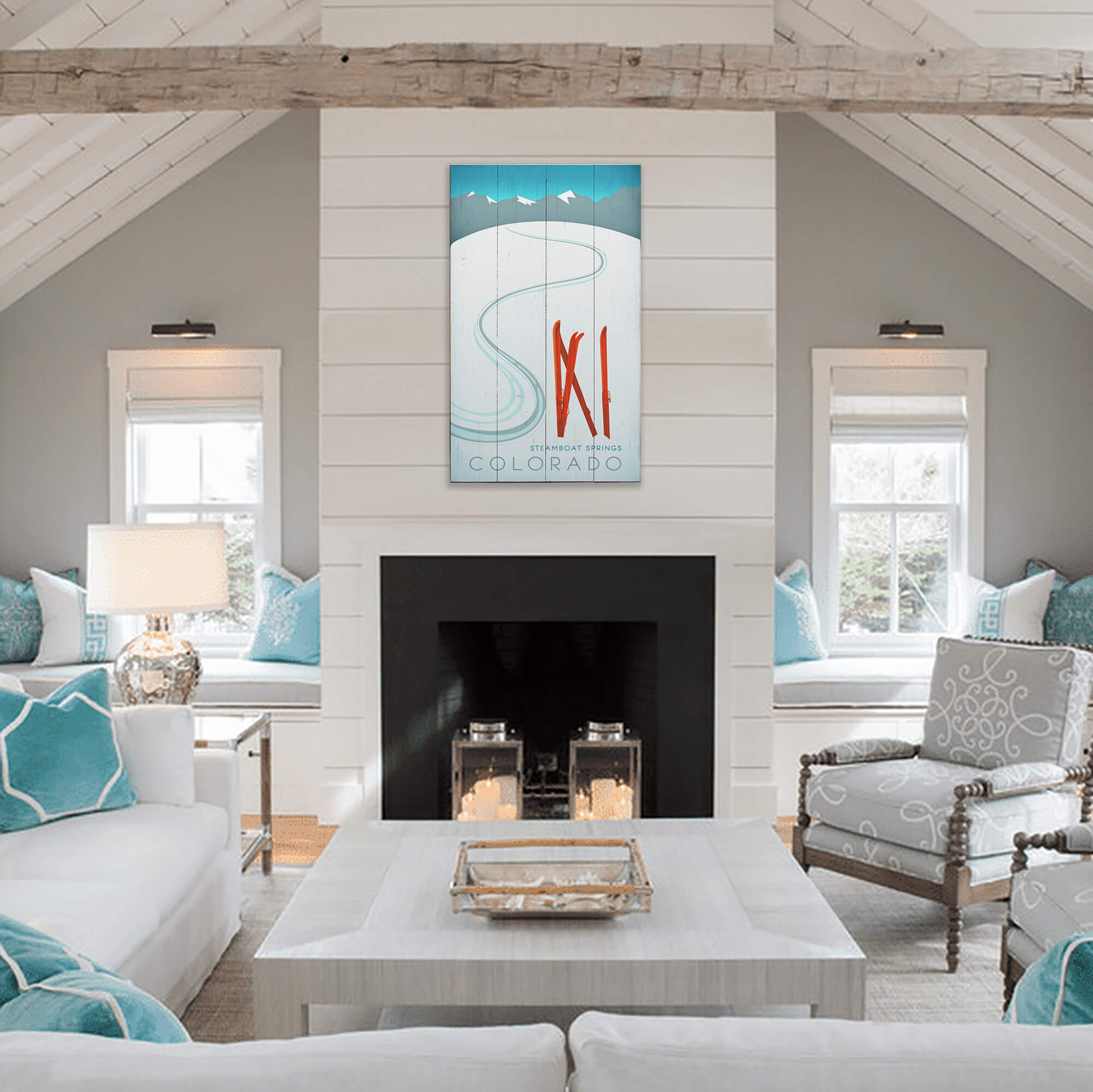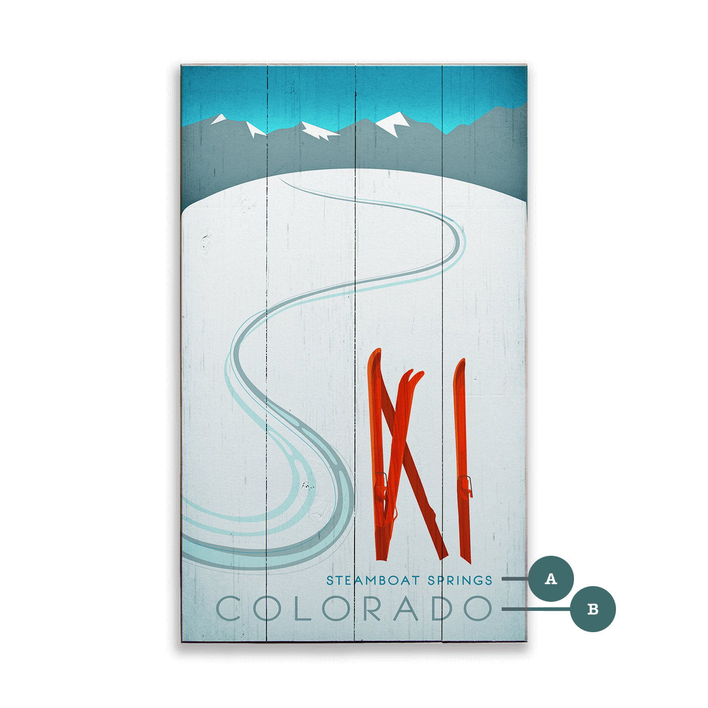 This clever ski-themed artwork blends minimalist design with visual storytelling, featuring a set of winding tracks and upright skis that together spell out the word “SKI.” Set against a serene, snow-covered slope with distant mountain peaks, it captures both the thrill of alpine adventure and the quiet beauty of a fresh powder day. The bold red skis and sweeping curves add a modern vintage flair, making it a perfect addition to cabins, lodges, or any space that celebrates the art of winter.