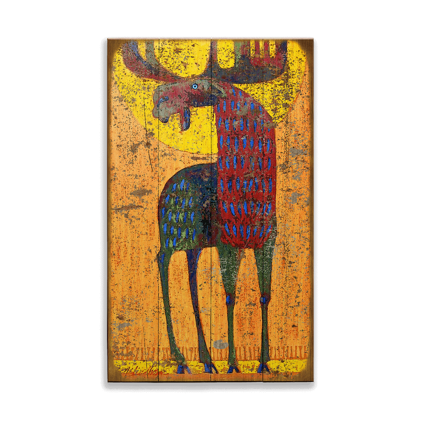 Discover the vibrant and mystical allure of this stunning artwork featuring a stylized moose set against a vivid yellow and orange background. The piece is distinguished by its bold, textured strokes and a rich palette of deep blues, reds, and greens, creating a striking contrast with the fiery backdrop. This artwork is a perfect example of modern expressionism, where abstract forms and intense colors evoke a strong emotional response, making it a captivating addition to any contemporary art collection. Ideal for art enthusiasts looking to add a touch of boldness and creativity to their decor.
