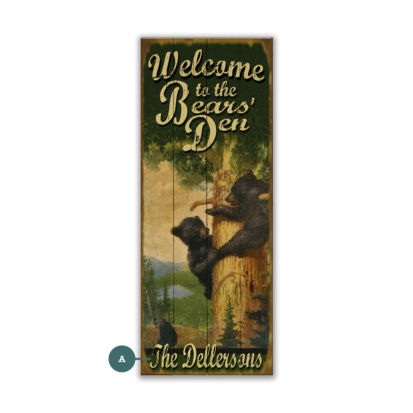 This charming woodland-themed wall art is perfect for creating a cozy and inviting atmosphere in any home or cabin. Featuring playful young bears climbing a tree against a scenic forest backdrop, the piece warmly welcomes guests to "The Bears' Den." The vintage-inspired design, combined with a rustic background, adds a touch of nature and nostalgia to your decor. Ideal for entryways, living rooms, or any space where you want to evoke the tranquility of the great outdoors.