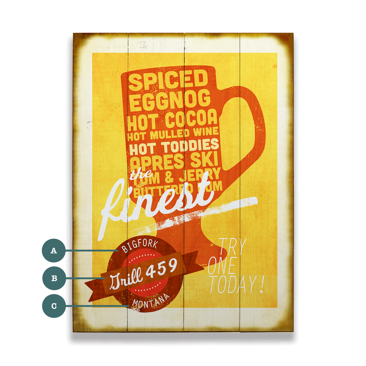 Warm up your space with this inviting poster showcasing winter favorites like Spiced Eggnog, Hot Cocoa, and Hot Toddy. Perfect for creating a cozy atmosphere during the cold season.