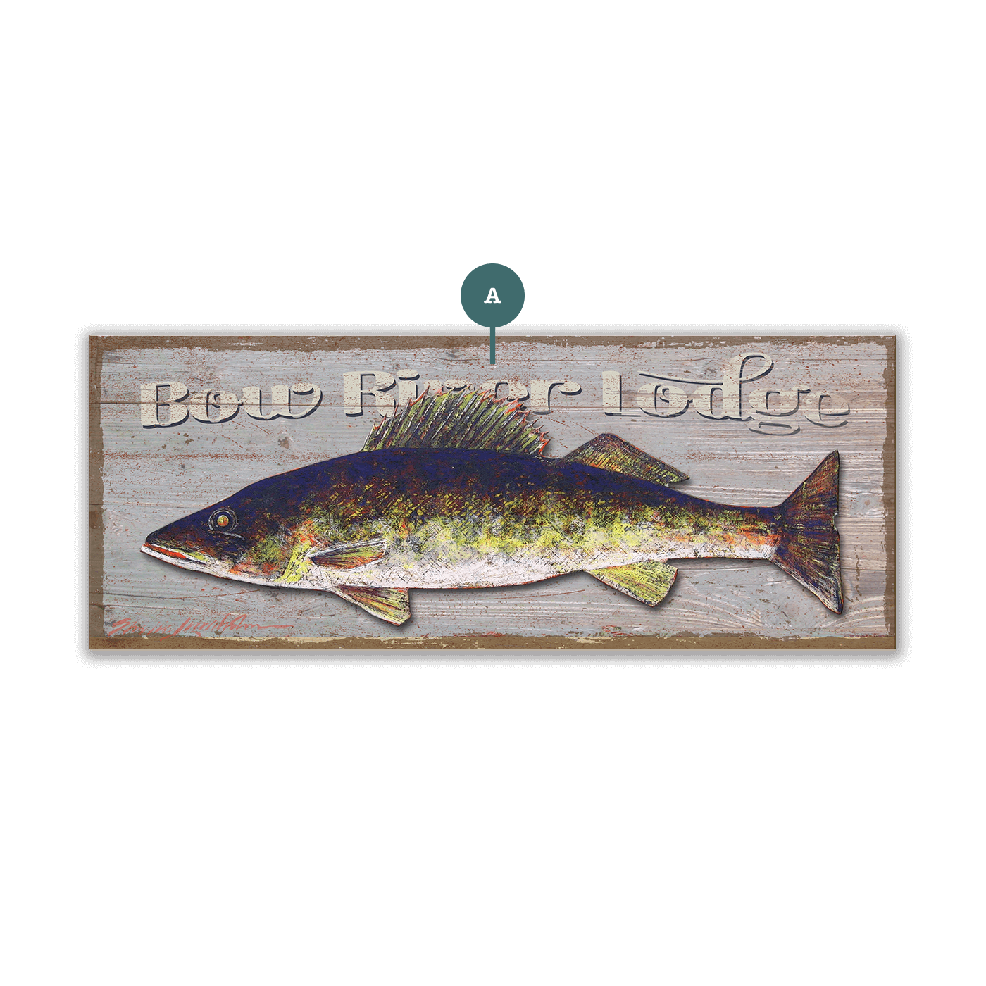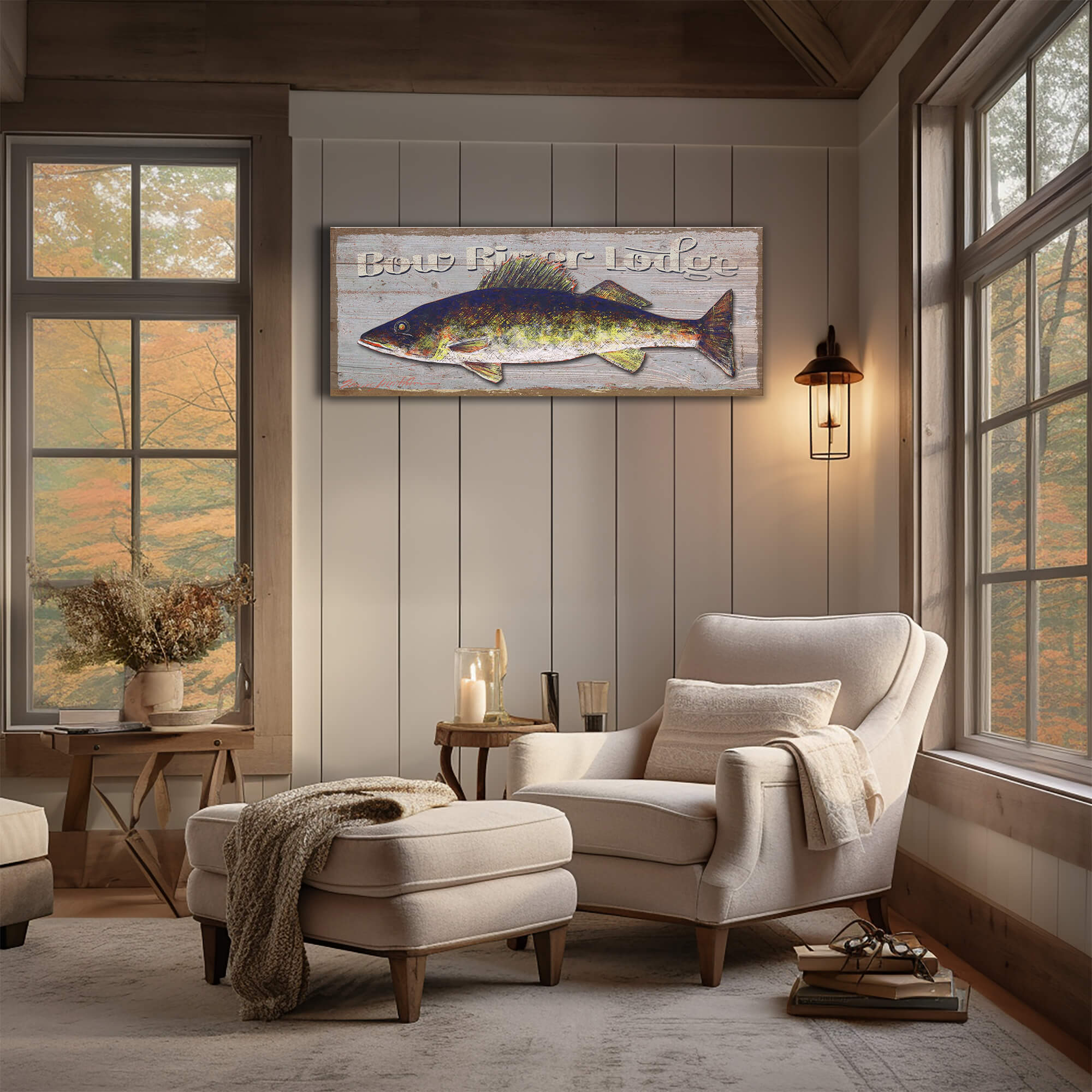 Elevate your interior with this distinctive walleye fish artwork, intricately printed on aluminum and mounted on a distressed, light tan wooden background. The vibrant, full-color print captures the lively essence of the walleye, showcasing its detailed features and rich hues.