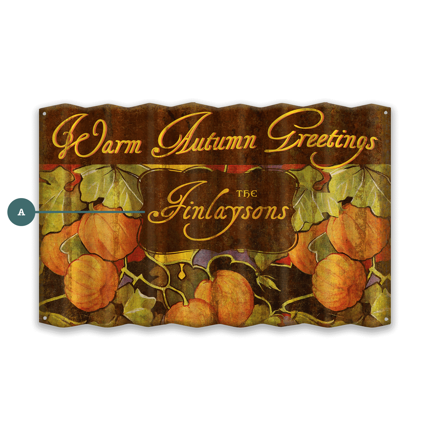 Embrace the warmth and richness of the harvest season with this charming autumn-themed sign. Set amongst a weathered garden patch, the design bursts with perfect pumpkins and curling vines in deep, earthy tones. The corrugated shape adds a rustic touch, while the elegant script conveys a heartfelt seasonal greeting. Perfect for adding cozy, festive flair to entryways, porches, or indoor spaces, this piece celebrates the beauty and abundance of autumn with timeless style.