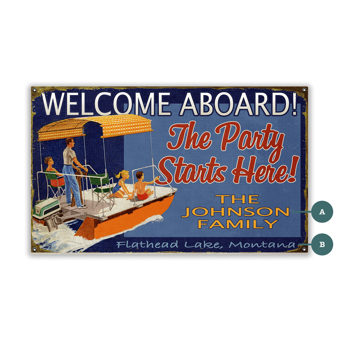 Set sail with the festive spirit of this vintage-style 'Welcome Aboard! The Party Starts Here!' artwork. Perfect for boat owners, marinas, or nautical themed events, this vibrant piece captures the joy of a day out on the water with friends and family. With its retro design and dynamic colors, this artwork is sure to add a splash of fun and welcoming charm to any seaside or lakeside decor.