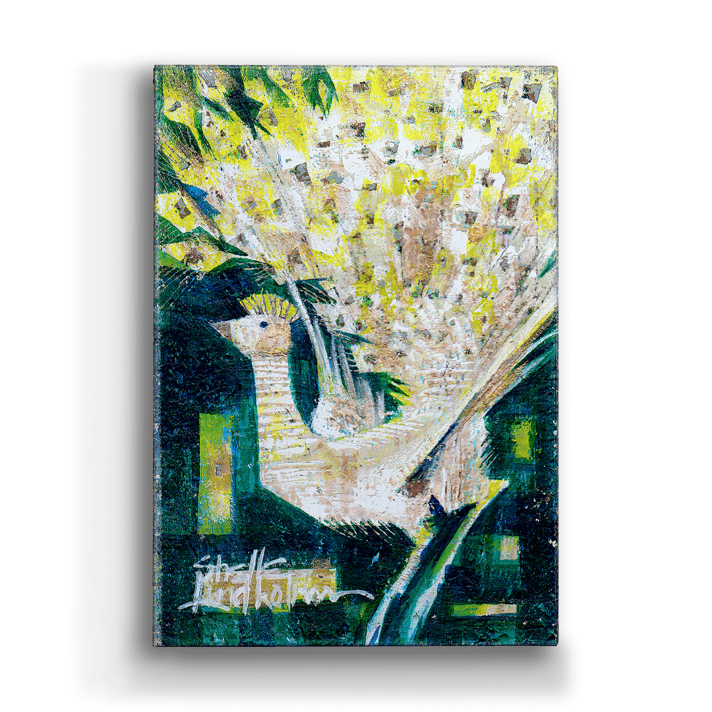 Bring elegance and light to your space with this captivating artwork of a white peacock fanning its feathers against a lush green backdrop. The soft, textured details and vibrant palette create a sense of movement and grace, making it a perfect centerpiece for any room. Ideal for art lovers seeking a blend of sophistication and natural beauty.
