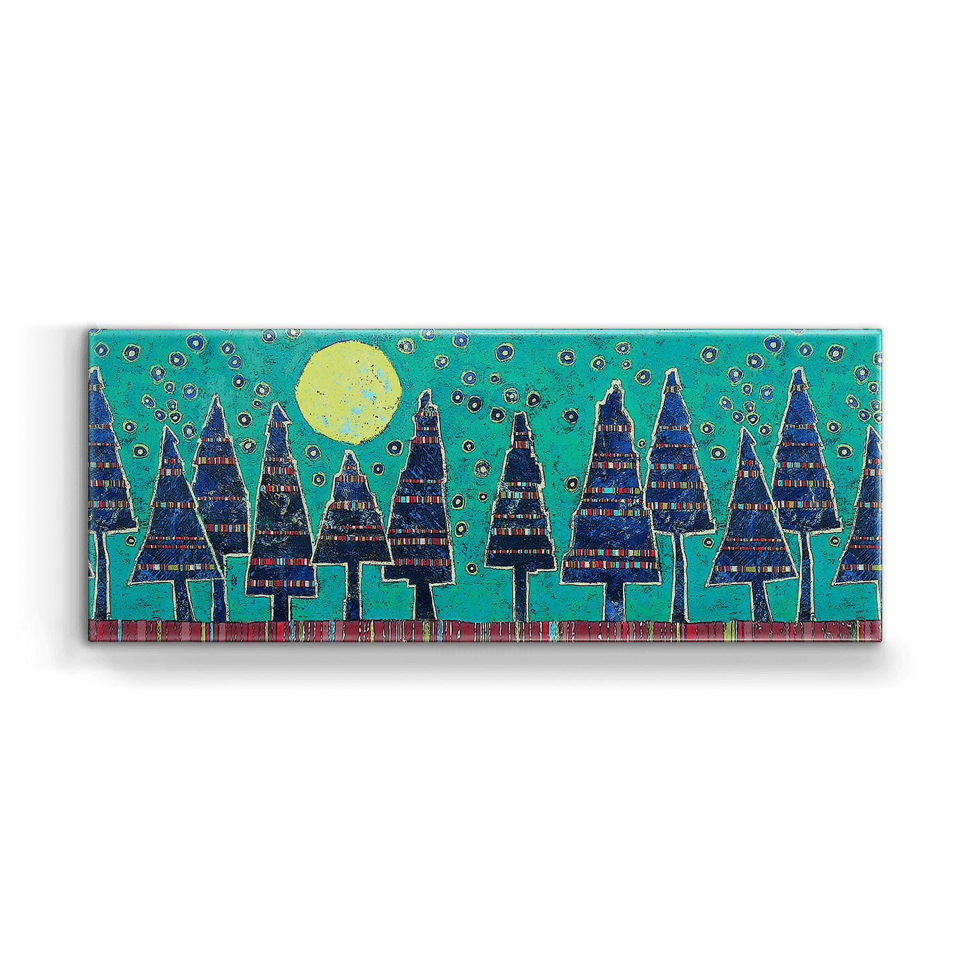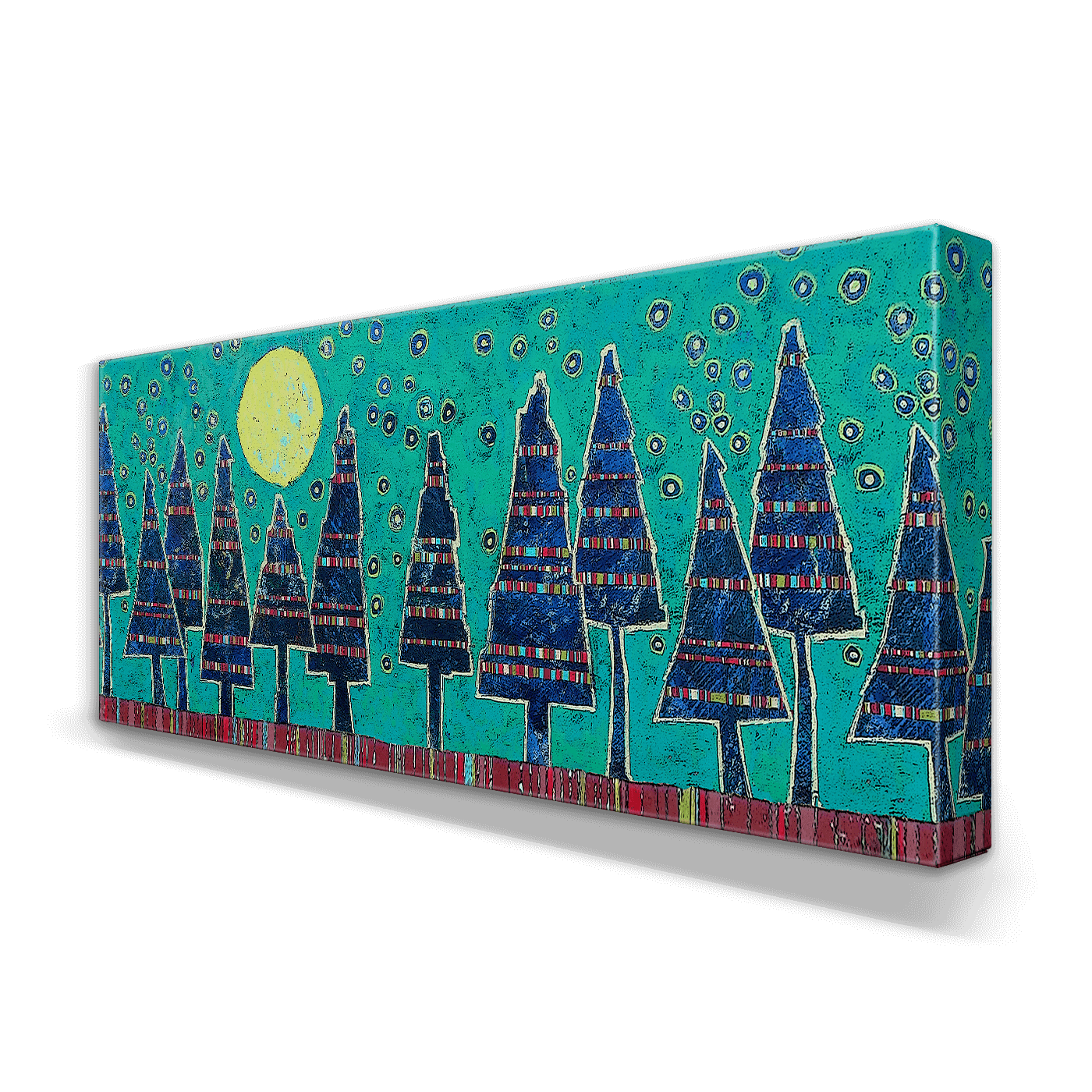 This enchanting artwork showcases a serene forest scene of deep blue trees under a glowing full moon. Delicate circular accents reminiscent of stars or snowflakes decorate the vibrant turquoise sky, adding texture and a sense of quiet magic to the piece. Perfect for bringing a touch of the outdoors into any space, this artwork combines a modern aesthetic with a tranquil, dreamlike quality, celebrating the beauty of nature and the night.