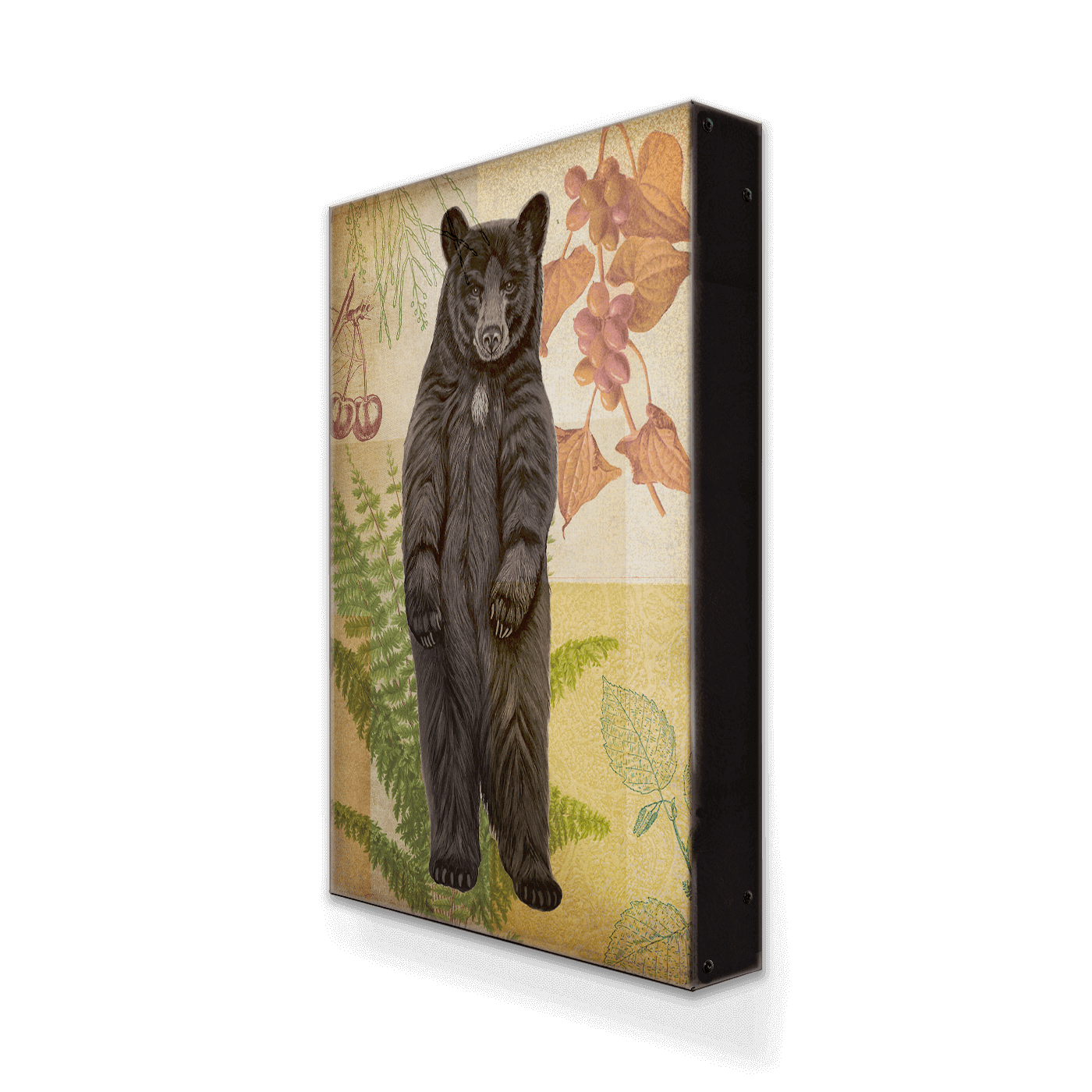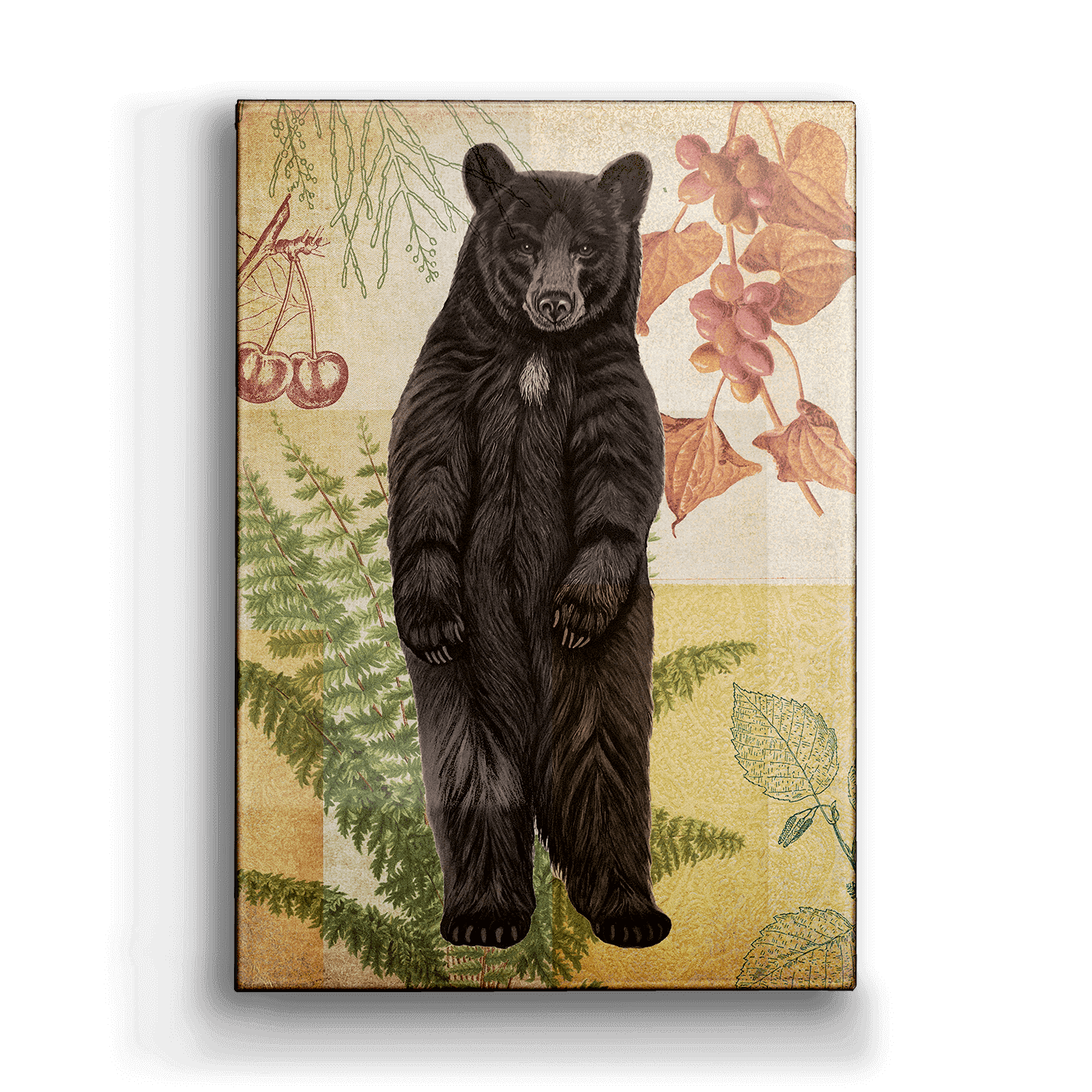 The bear, an emblem of strength and majesty. The depiction of this imposing creature in its natural habitat highlights the grandeur of the wilderness, invoking feelings of tranquility. The bear's powerful presence against a verdant backdrop of forest flora creates a visually stunning contrast that breathes life into any room.