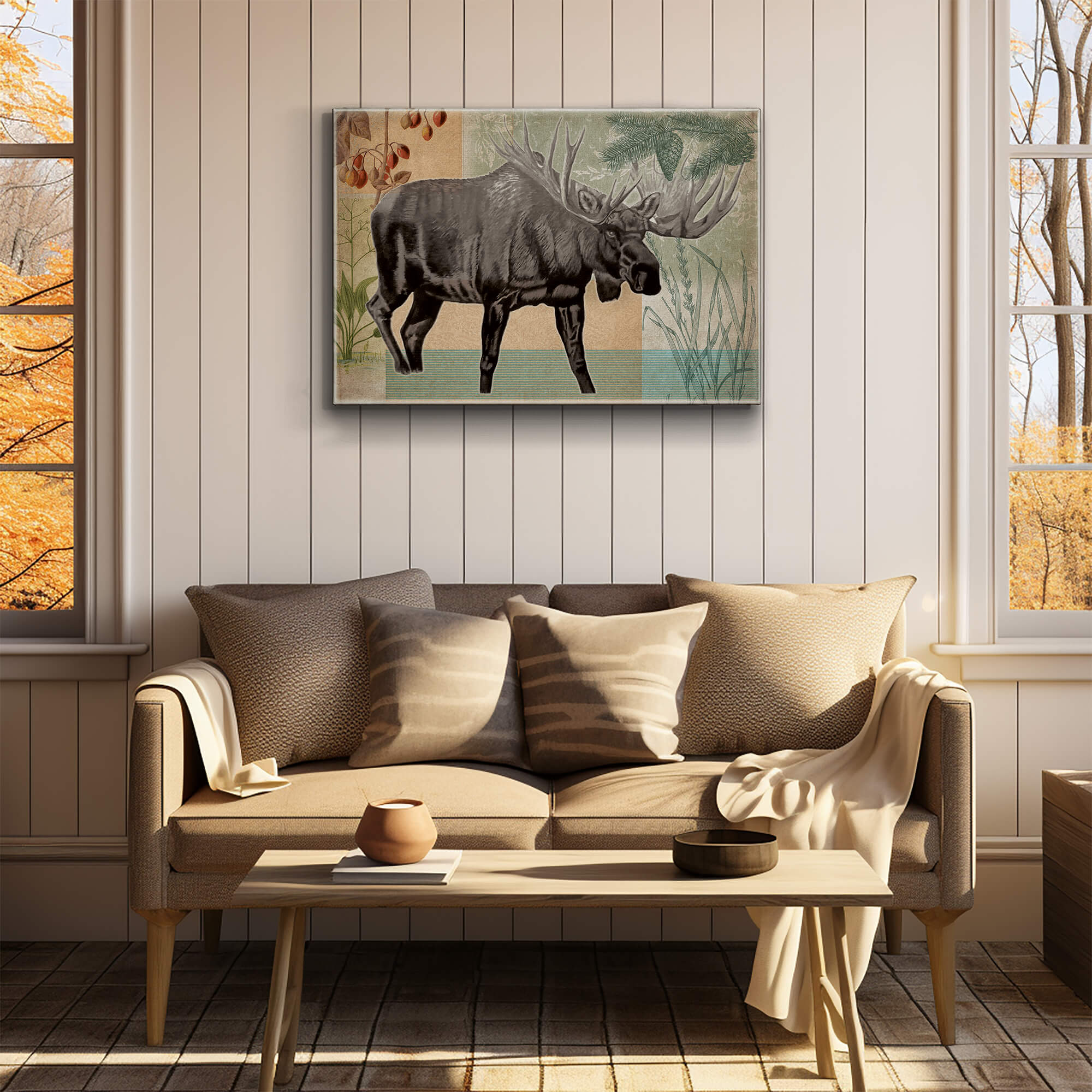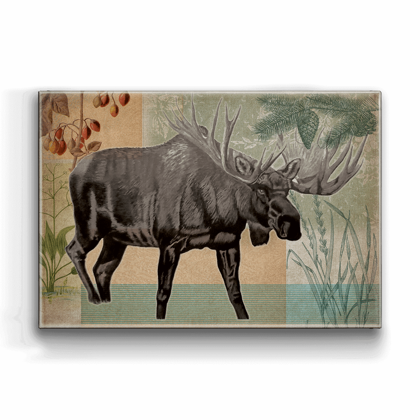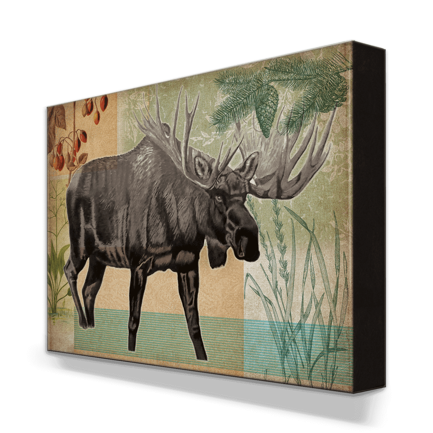 The moose, a gentle giant of the forest, is expertly depicted in this artwork. The beautiful rendering of this majestic creature amidst the tranquil wilderness creates an imposing yet serene image, perfect for bringing a touch of nature's grandeur into your home.