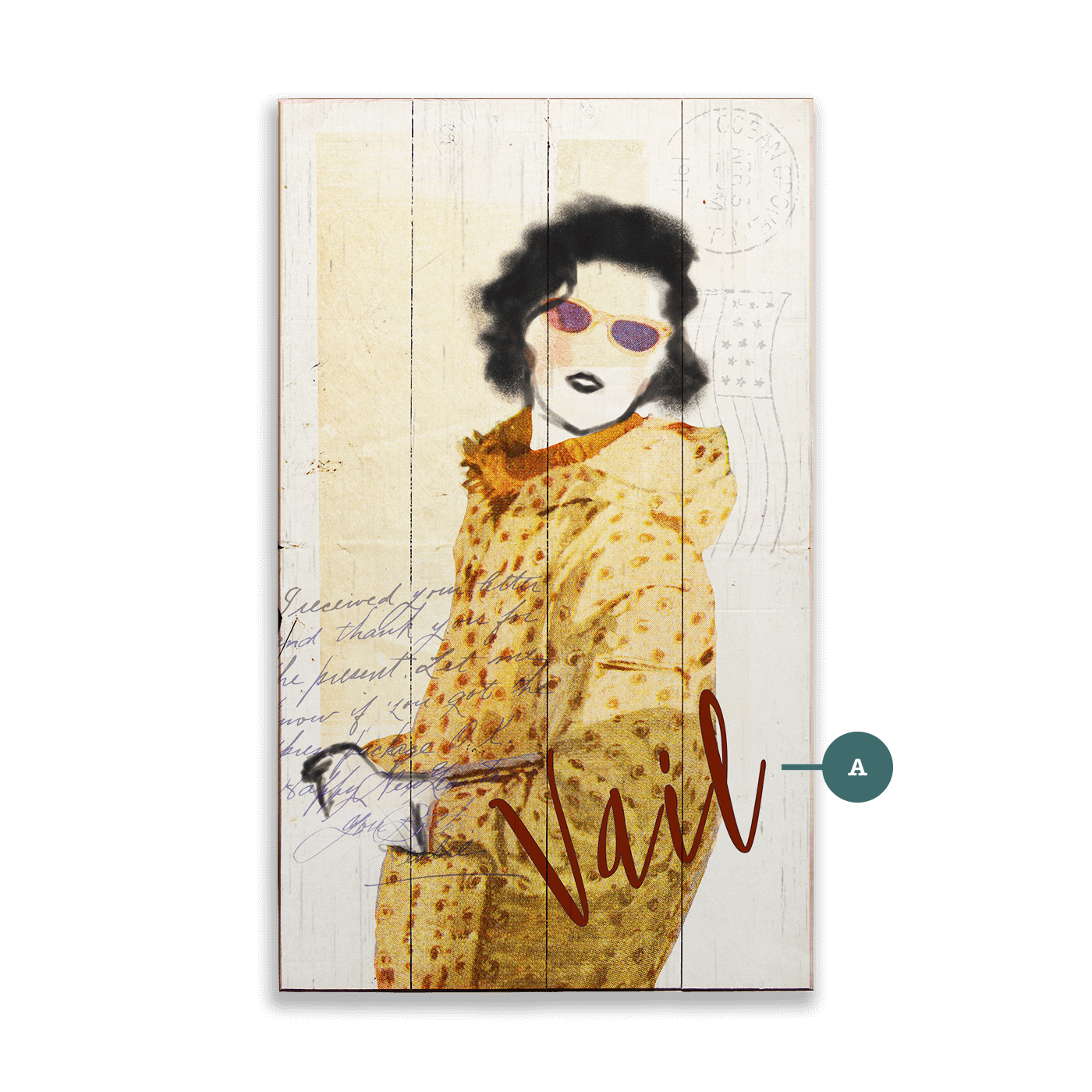Part of our Winter Fashion Postcard series, this stylized winter portrait captures a retro-chic figure in a golden polka-dot coat, confidently posing against a collage of vintage textures, handwriting, and postmarks. With bold sunglasses and gloved hands, she embodies slope-side glamour and après-ski attitude. The hand-lettered script adds a designer touch to this fashion-forward alpine aesthetic—perfect for modern lodges, boutique rentals, or seasonal wall decor with a dash of nostalgic cool.