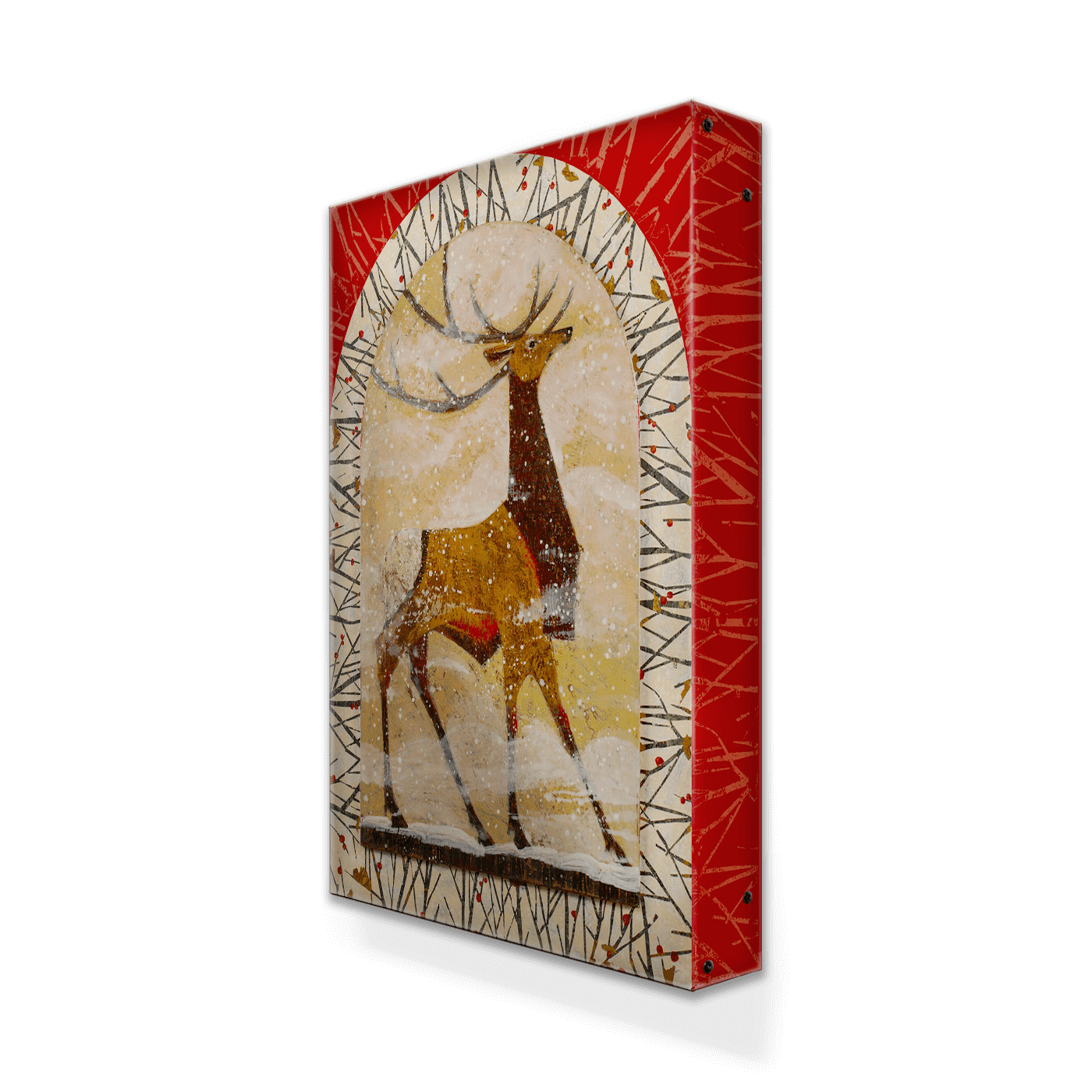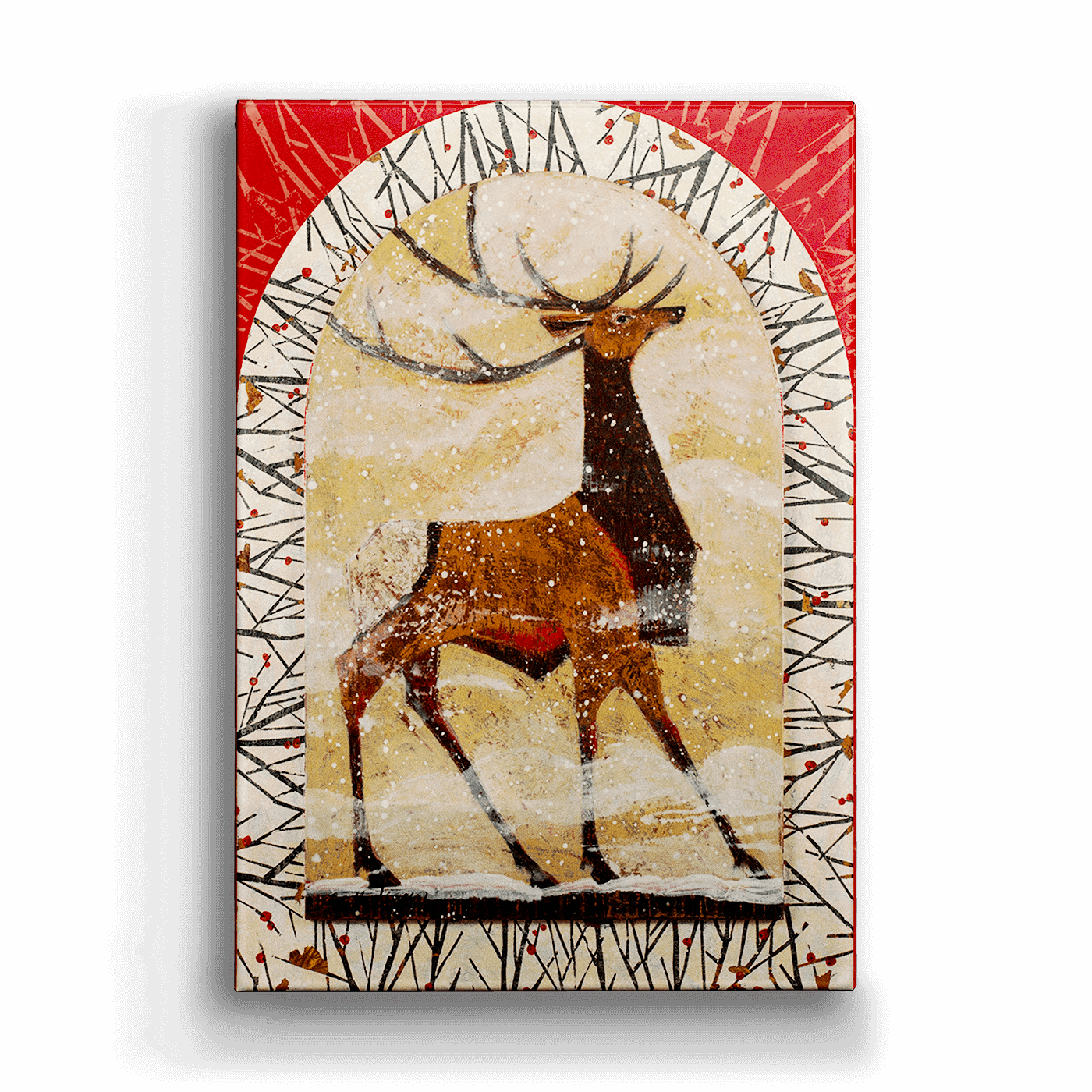 Embrace the spirit of the season with 'Winter Wapiti Elk,' a stunning piece that captures the elegance and majesty of a wapiti elk against a snowy backdrop. This art features a beautifully rendered elk within a festive, arched window design, set against a vibrant red and snowy scene with the message 'Merry Christmas.' Ideal for enhancing your holiday decor, this piece combines rustic charm with a touch of elegance, making it a perfect addition to any home during the festive season.