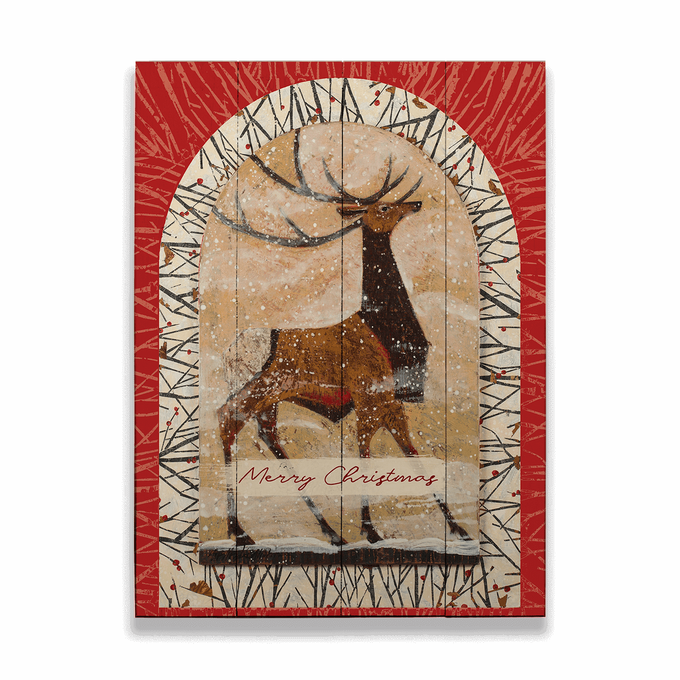 Embrace the spirit of the season with 'Winter Wapiti Elk,' a stunning piece that captures the elegance and majesty of a wapiti elk against a snowy backdrop. This art features a beautifully rendered elk within a festive, arched window design, set against a vibrant red and snowy scene with the message 'Merry Christmas.' Ideal for enhancing your holiday decor, this piece combines rustic charm with a touch of elegance, making it a perfect addition to any home during the festive season.