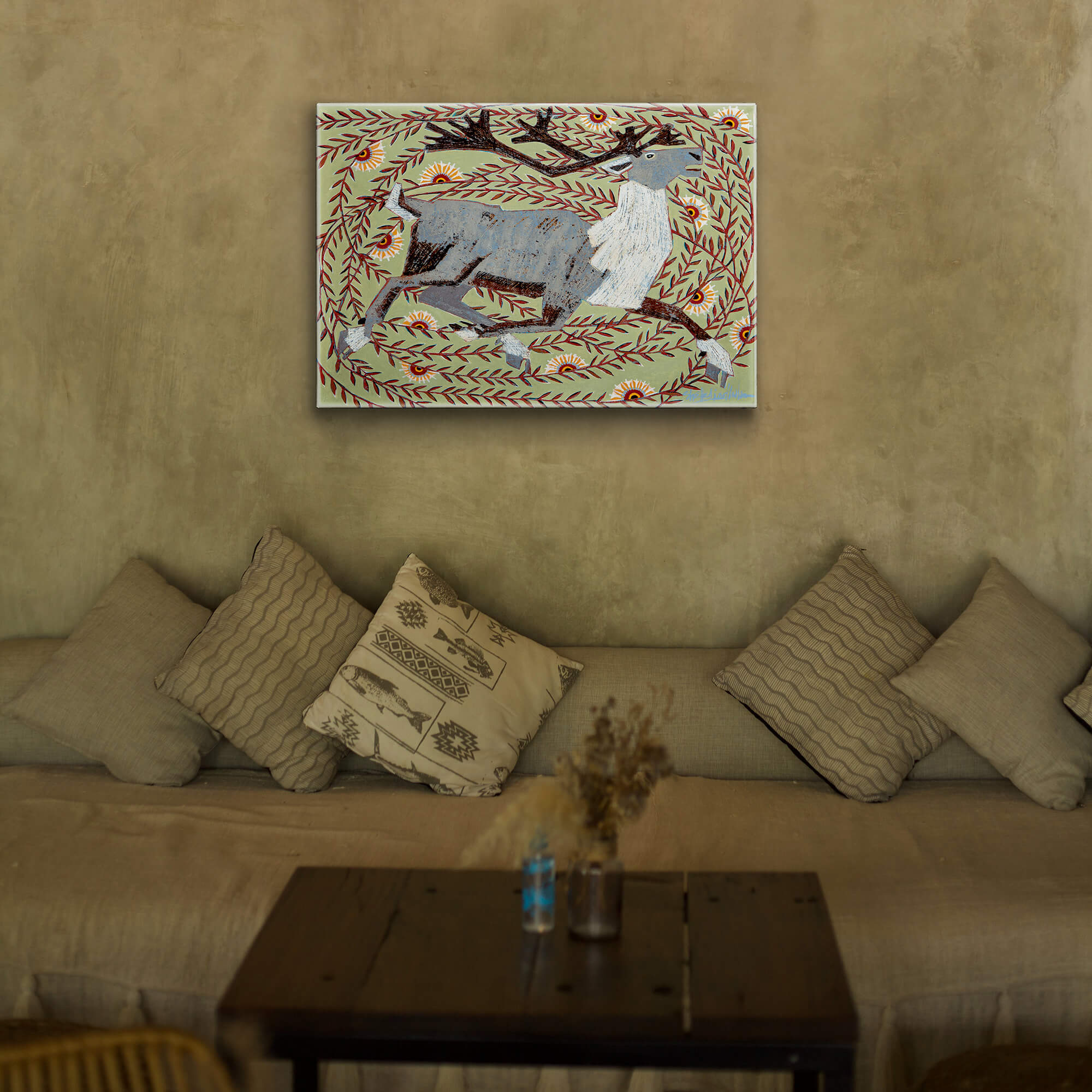This vibrant artwork showcases a majestic caribou surrounded by a lively pattern of foliage and flowers. The piece's dynamic movement and intricate detailing capture the energy and beauty of the natural world. With its earthy tones and whimsical design, this caribou artwork is perfect for nature lovers and those who appreciate wildlife-themed décor. Whether displayed in a home or office, this artwork adds a touch of the wild outdoors and serves as a unique, eye-catching piece for any space.