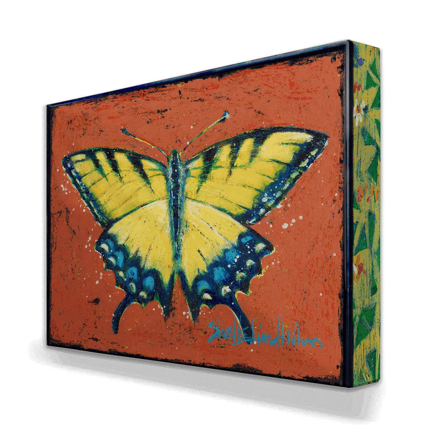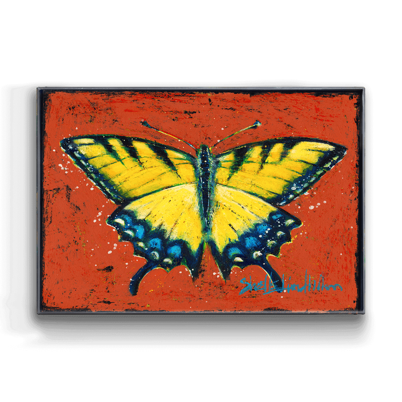 Brighten up your space with this vibrant depiction of a Yellow Swallowtail butterfly. This artwork pops with vivid yellow and blue hues against a fiery red background, capturing the lively essence and delicate beauty of this beloved butterfly. Ideal for adding a splash of color and nature-inspired charm to any room, this piece is perfect for collectors and enthusiasts who appreciate both art and the natural world. This piece is part of Shelle Lindholm's "Winged Wonders" series.